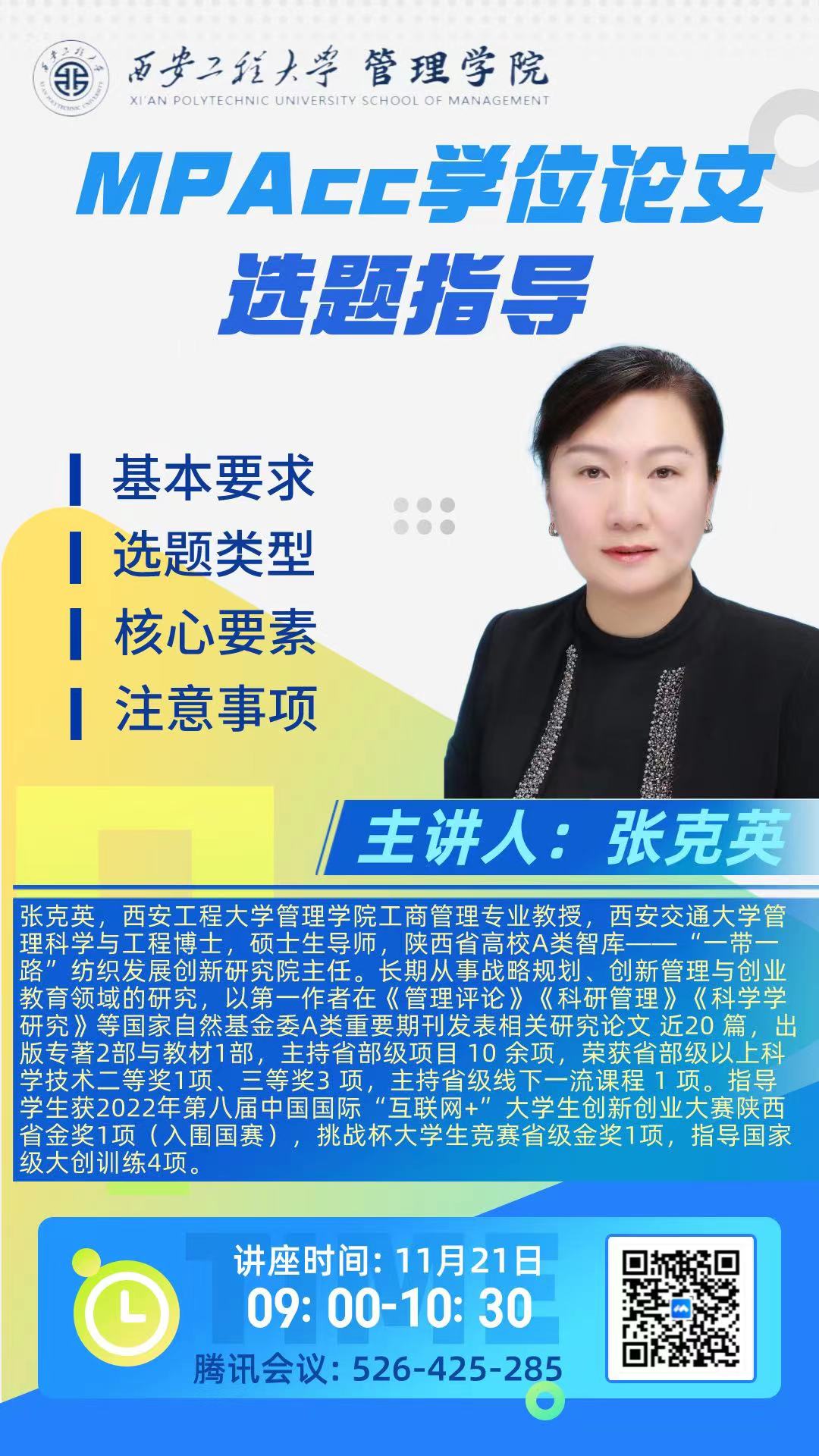 2022年11月21日上午,张克英教授在人文管理楼502为会计硕士(MPAcc)研究生作了《MPAcc学位论文选题指导》的报告。2022级MPAcc全体在校同学线下参会,2020级MPAcc、2021级MPAcc研究生通过腾讯会议线上参会。