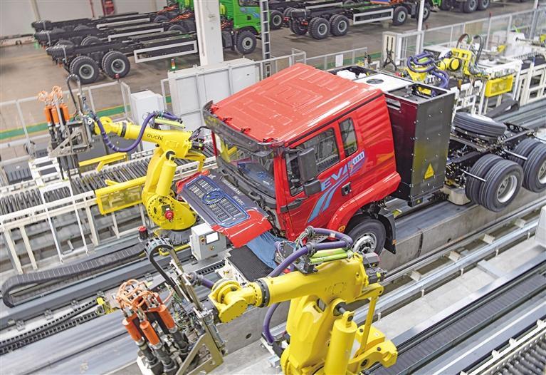 在新能源车间,同学们看到新能源智能工厂生产线上一片繁忙,大大小小的汽车零部件在自动引导车上有序传输,随着机械臂的精准投放,大到轮胎,小到螺母,一个个零部件被迅速拼装到车架上,每6分钟,就有一辆新能源重卡从这里“走”下生产线。讲解员向同学们介绍新能源车间的生产工艺特点以及新能源汽车的核心技术,如电池管理系统、电机驱动系统等。同学们了解到陕汽在新能源汽车领域的战略布局和技术创新成果,以及新能源汽车在节能减排、推动可持续发展方面的重要意义。通过对比传统燃油汽车与新能源汽车的生产工艺和成本结构,同学们对新能源汽车产业的财务分析和成本控制有了更深入的思考,为今后在相关领域开展财务研究和工作奠定了基础。