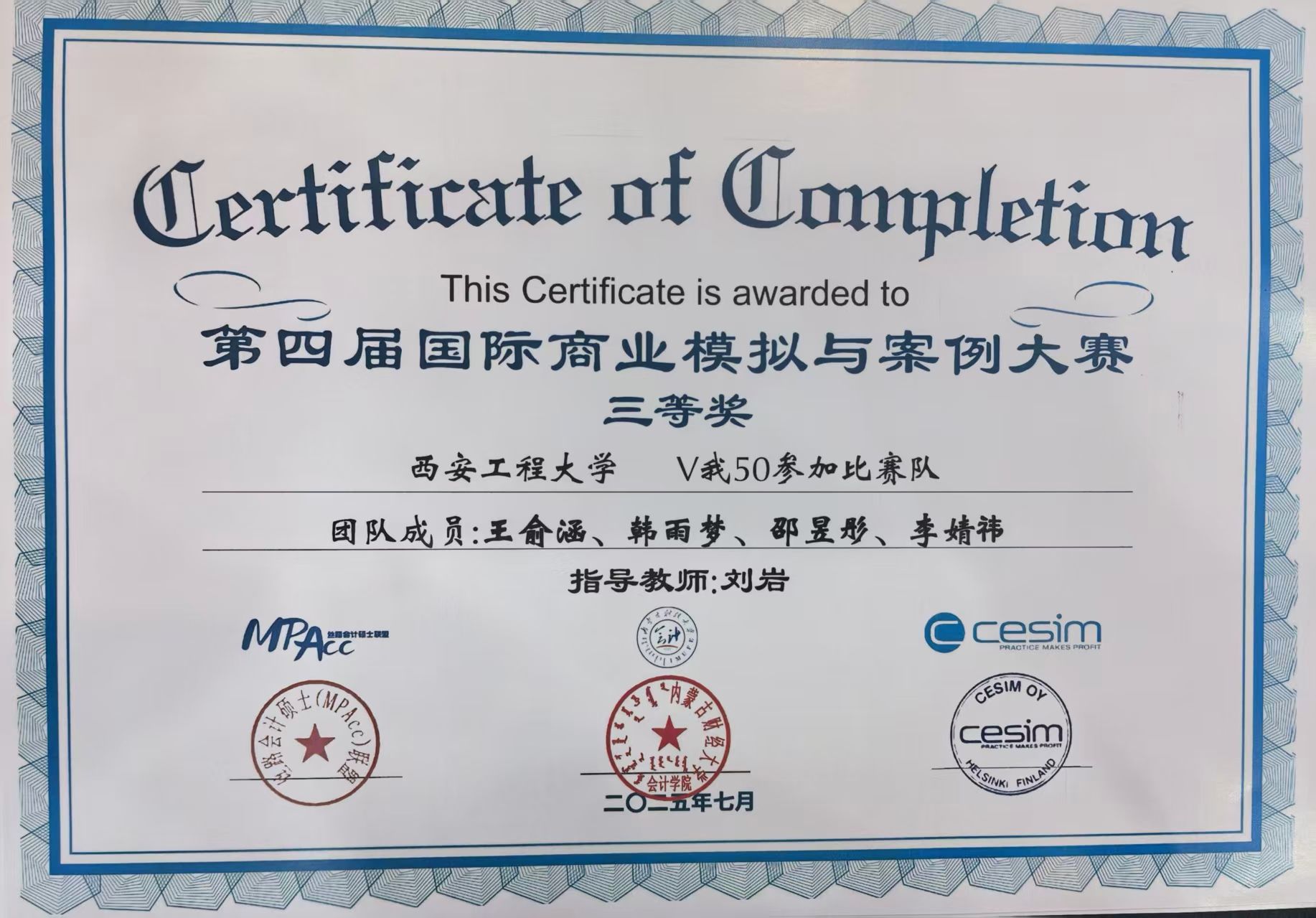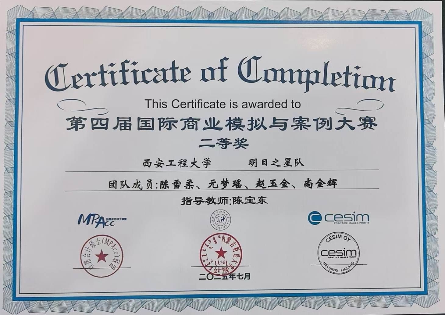 2025年7月16日至17日,由全国会计专业学位研究生教育指导委员会指导、丝路会计硕士(MPAcc)联盟主办、内蒙古财经大学会计公司承办、芬兰Cesim协办的丝路会计硕士(MPAcc)联盟第五届年会(2025)暨第四届丝路会计硕士(MPAcc)联盟国际商业模拟与案例大赛总决赛于内蒙古圆满落幕。本届年会与会代表和参赛队员来自9省41所高校,MPAcc研究生陈雪柔、元梦瑶、赵玉金、尚金辉等代表公司参加了本次大赛的总决赛。在此次大赛中,2026世界杯指定网站MPAcc学子表现出色,取得全国二等奖1项、三等奖1项、最佳视频奖的好成绩,2026世界杯指定网站陈宝东教授被评为优秀指导教师。
