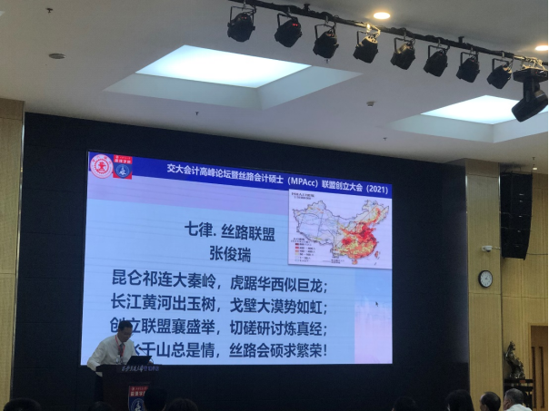 张俊瑞教授在题为“万水千山总是情,丝路会硕求繁荣”的报告中讲述了他提议成立“丝路会计硕士(MPAcc)联盟”的初心与愿景,回顾了丝路沿线高校会计硕士培养的发展历程,分析了联盟高校的办学特色和取得的成绩,并揭示了联盟成员与东部发达地区存在的差距。他鼓励成员单位突出办学特色、完善培养模式,在获得优秀论文、优秀案例和案例大赛获奖等硬指标上增加数量、扩大覆盖面、提高质量,希望联盟成员单位互相沟通、增进交流、寻找差距、追赶超越,并赋诗《七律·丝路联盟》表达了对联盟合作发展的期盼之情。