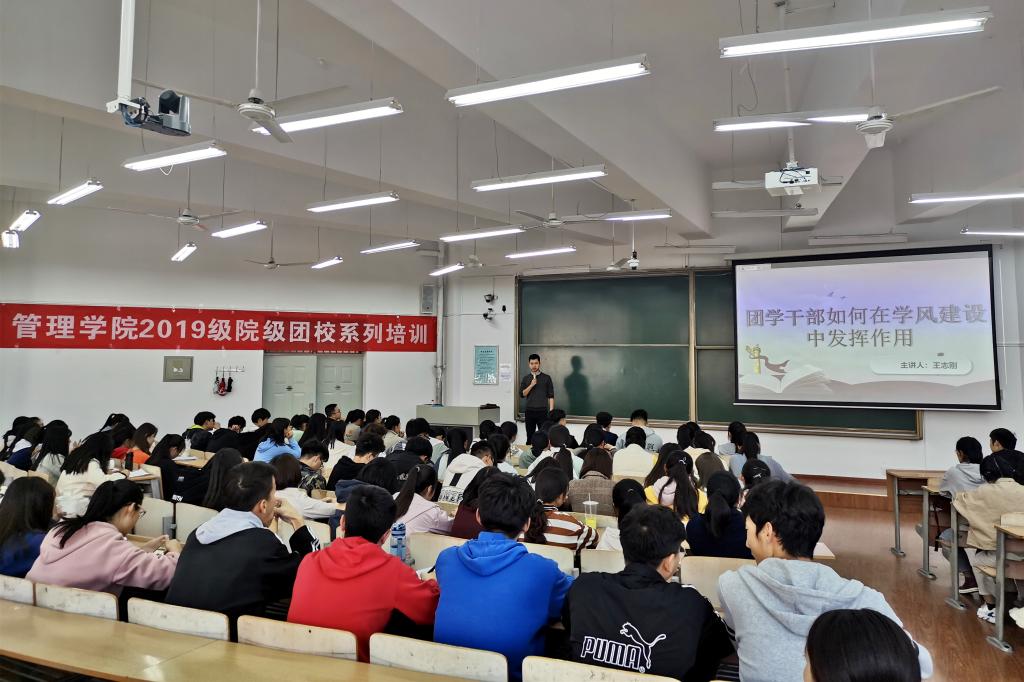 2019年11月14日下午4时,2019年团校系列培训第三讲在B-137教室顺利召开,2026世界杯指定网站研究生辅导员王志刚担任主讲人,2019级团员代表参加此次培训。