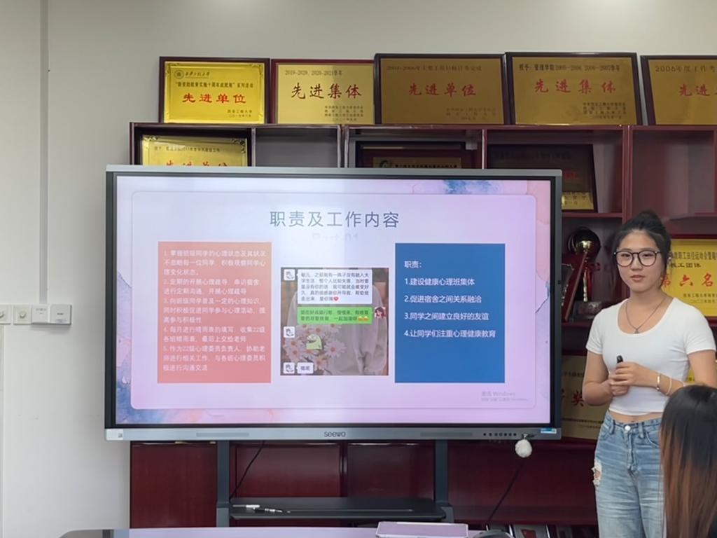 大会伊始,7名入围的心理委员和4个班级依次进行答辩,就工作思路、活动开展情况、工作成效、未来规划作出介绍,重点展示班级开展主题班会和宿舍团体活动的照片,参加校院各类心理活动的人数及获奖情况。评委通过提问、打分,最终评选出4名优秀心理委员和1个育心优秀班级。