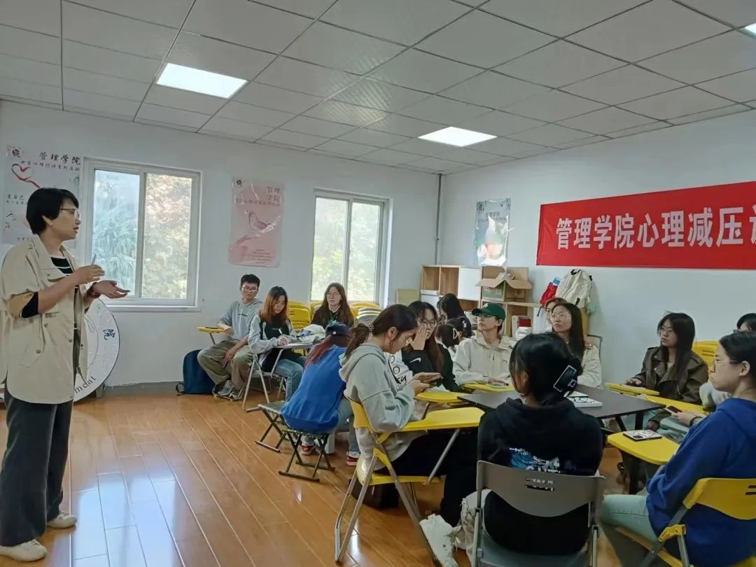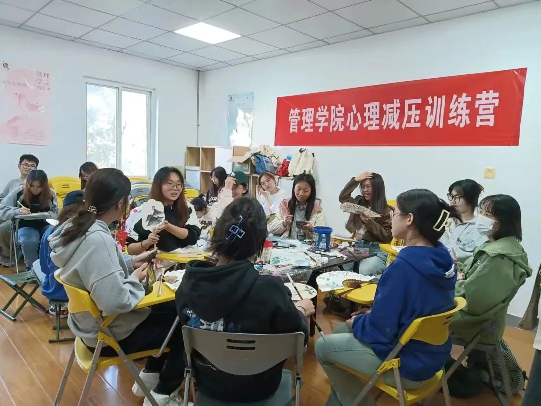 活动中,刘蓉介绍了压力的概念、组成部分、表现形式,让同学们察觉自己的压力及压力体验,并通过共创的方式,让大家分享自己的减压方法。之后,刘蓉带领大家一起学习了如何科学减压,着重介绍了表达性艺术治疗的方式,通过绘制扇面,鼓励大家把情绪表达出来,以期达到减压的目的。
