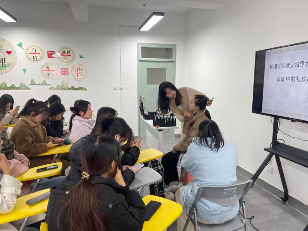 常方元为在场员工详细讲解了求职过程中的着装礼仪。她讲到,合适的着装不仅是尊重自己,更是尊重他人的表现,也是对企业文化的良好体现。她以现场的男、女生为模特进行了化妆实操演示。她根据每位员工的脸型、肤色等特点,为他们量身定制了适合的妆容。她的化妆技巧娴熟,每一个步骤都讲解得清晰明了,让同学们受益匪浅。在常老师的指导下,男生们学会了如何打造简约而不失大气的妆容,凸显自己的自信风采与帅气;女生们则掌握了如何妆点自己的容颜,展现出清新自然的美感。通过常老师的现场化妆指导,同学们不仅提升了自己的形象,更增添了自信与魅力。活动持续近两个小时。