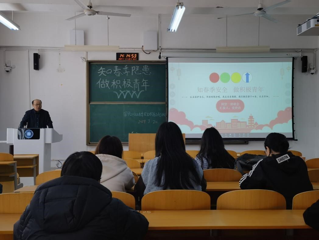 3月20日下午,国际经济与贸易专业2021级1班在D-1112教室举办春季安全教育主题班会和“三全育人系列讲座”。班主任王铁山副教授参会并做主题讲座,国际经济与贸易专业2021级1班全体同学参加,班长党世浩主持班会。
