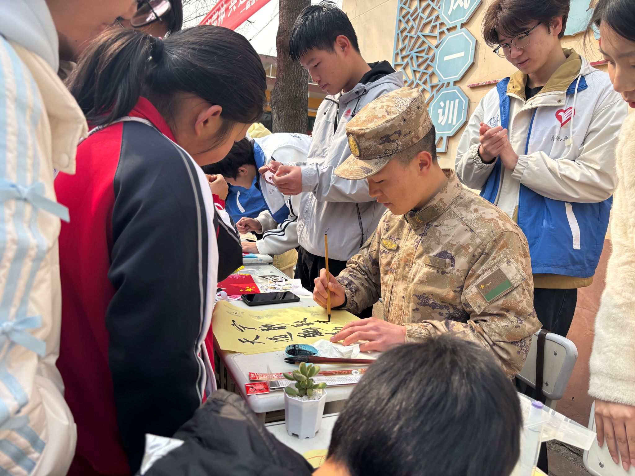 活动现场,军地校三方联袂呈现《学习雷锋好榜样》合唱、《咱当兵的人》军歌嘹亮、《祖国赞歌》诗歌朗诵等文艺节目;公司志愿者与小员工共绘“雷锋故事”长卷,用童真笔触诠释助人美德;志愿者反诈宣传站发放手册300余份,结合防诈问答赠送绿植,书法体验吸引居民书写“雷锋语录”;部队军医为社区老人提供义诊服务,官兵同步开展义务理发、环境清扫等便民行动,累计惠及群众百余人次。