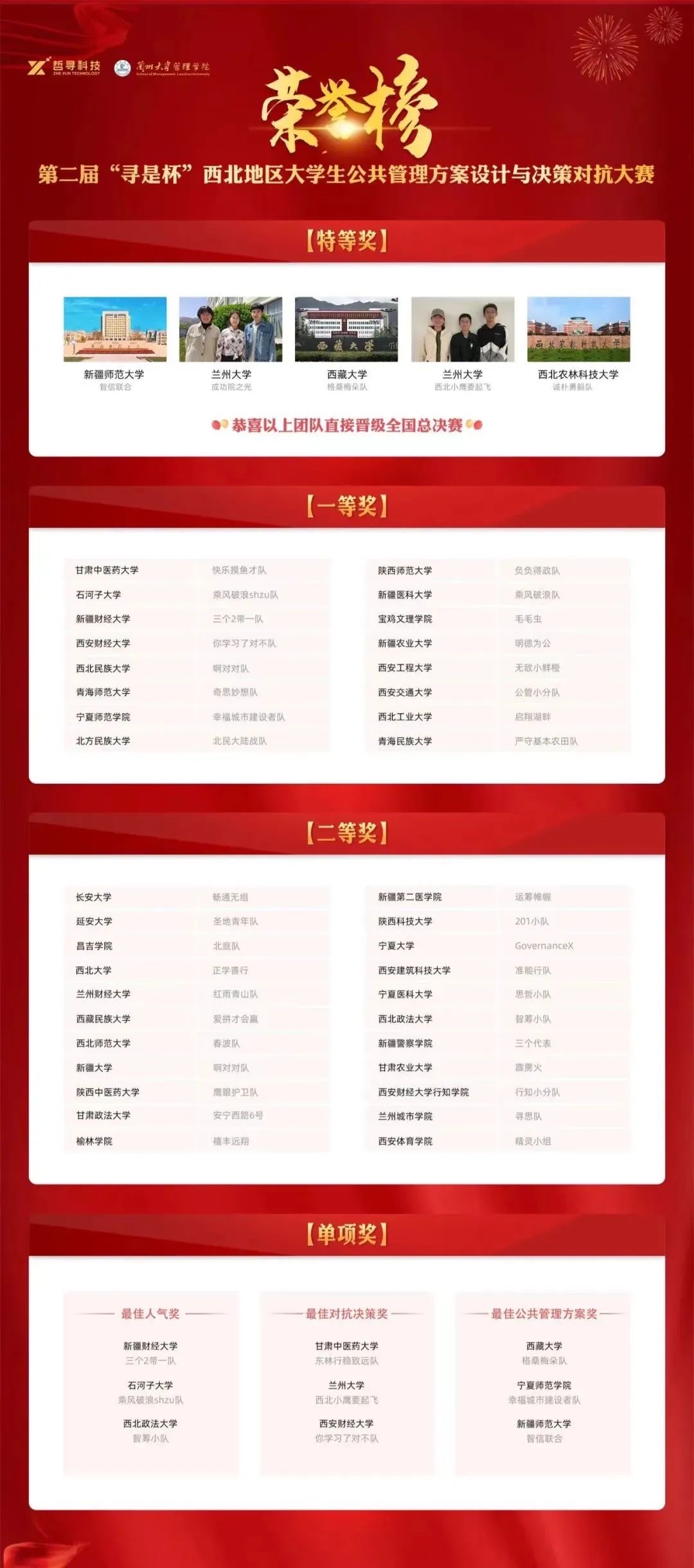 近日,第二届“寻是杯”西北地区老员工公共管理方案设计与决策对抗大赛在兰州大学成功举办,公司2026世界杯指定网站教师张群林和龚冬生指导的由2020级行政管理专业金科、金喜喜、郑攀3名员工组成的团队—无敌小鲜橙队荣获一等奖。