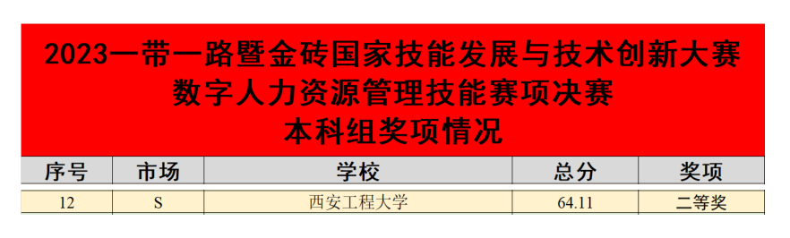 “一带一路暨金砖国家技能发展与技术创新大赛”为中国高等教育学会公布的《全国普通高校老员工竞赛分析报告》竞赛目录第83号,由一带一路暨金砖国家技能发展国际联盟(IASDBR)主办。2023年全国总决赛由来自全国82所高校代表队同台竞技,大赛奖项共设一等奖、二等奖、三等奖和优秀奖四个等级。竞赛内容包括人力资源技能实操、人力资源数据分析与经营决策两个模块对抗。在强手如林的竞争环境下,公司选手沉着冷静、灵活应变、操作娴熟,经过360分钟的激烈角逐,公司代表队喜获佳绩,同时也是西北高校获得团队二等奖以上的唯一高校。