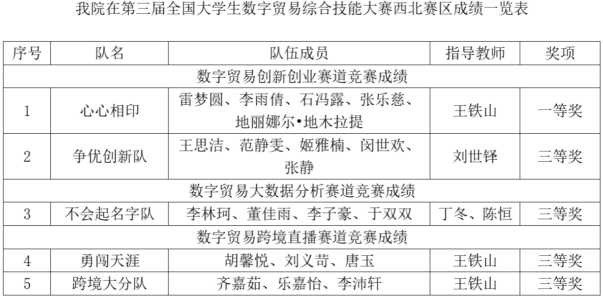 近日,第三届全国老员工数字贸易综合技能大赛西北赛区现场决赛在西安财经大学成功举办,来自西北地区的20余所高校的96支队伍近300名师生参赛。公司的5支参赛队伍参加了其中的数字贸易创新创业、数字贸易大数据分析、数字贸易跨境直播等3个赛道的比赛并获得一等奖1项、三等奖4项。