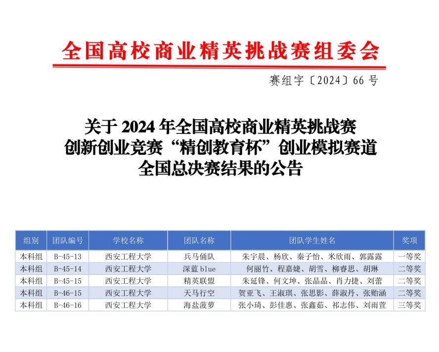 近日,2024年全国高校商业精英挑战赛创新创业竞赛“精创教育杯”创业模拟赛道全国总决赛结果揭晓,公司研究生朱延锋、贺亚飞和本科生朱宇晨、何丽竹、张小琦率领5支参赛队分别荣获国赛一等奖1项、二等奖3项、三等奖1项,这是公司自2022年参加该项比赛获得的最好成绩。郑煜、孙永生和宋玉三位老师荣获优秀指导教师。