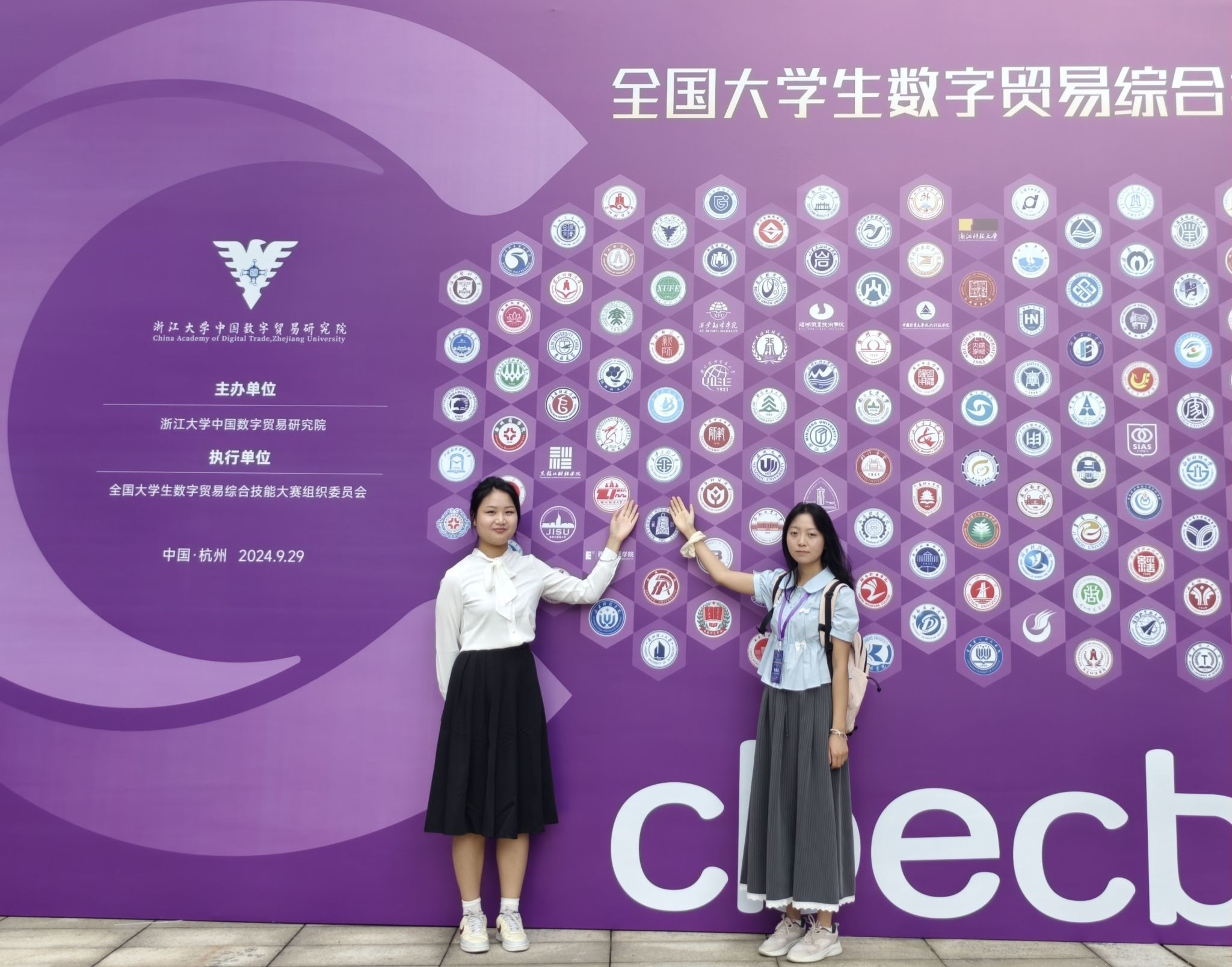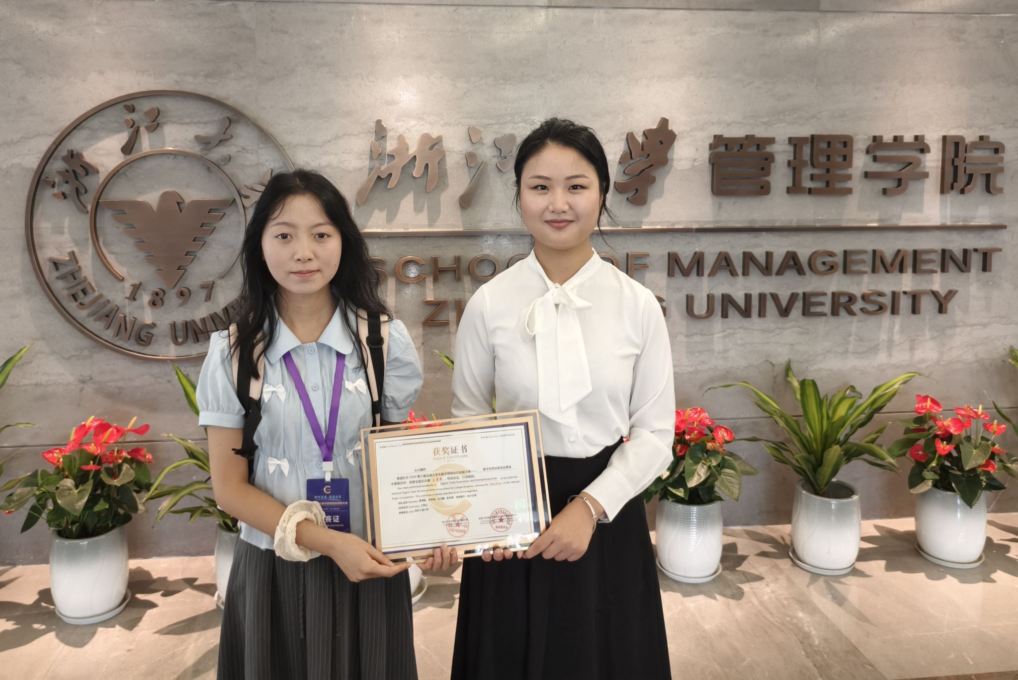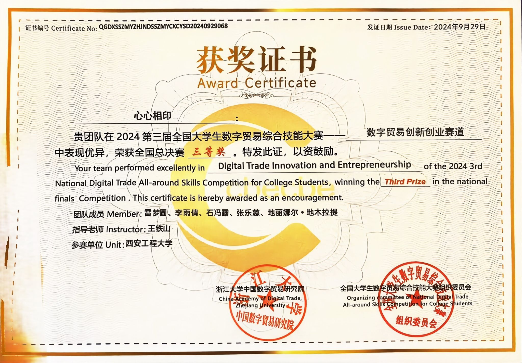 2024年9月29日,第三届全国老员工数字贸易综合技能大赛全国总决赛颁奖典礼在浙江大学紫金港校区金色大厅举行。来自2021级国际贸易专业的本科生雷梦圆、李雨倩团队在王铁山副教授的指导下获得“数字贸易创新创业赛道”全国三等奖。