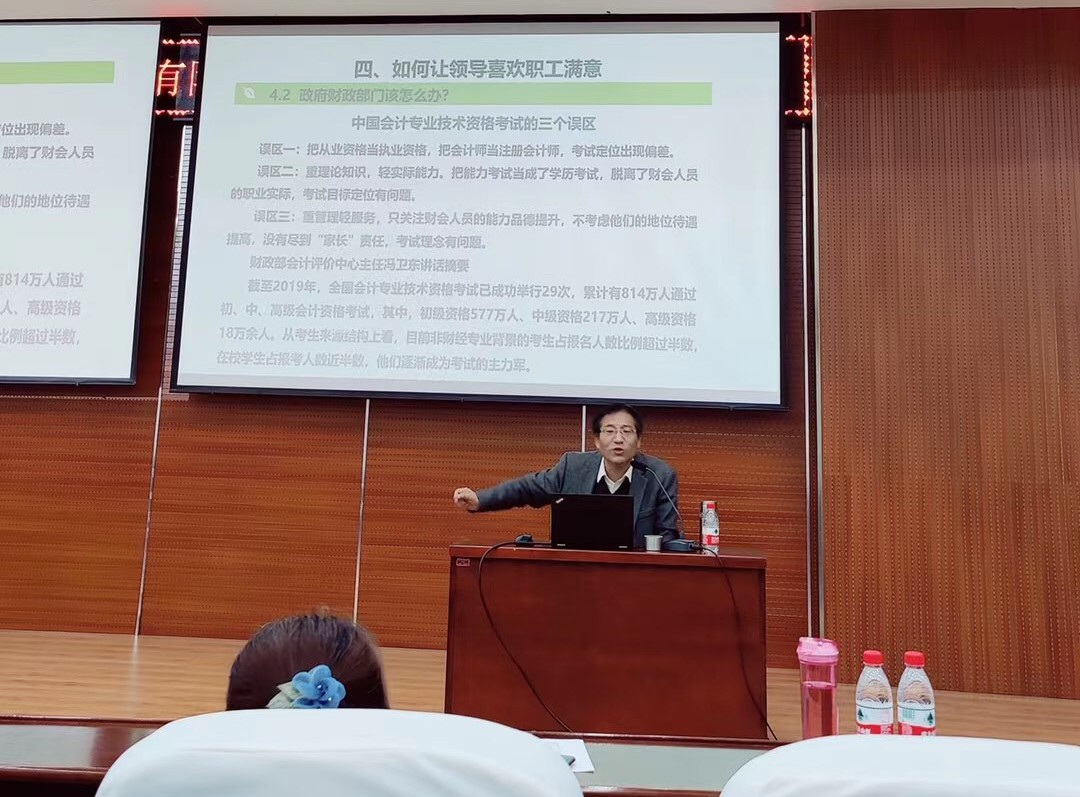 最后,他从国家、政府财政部门、政府主管部门、企业管理、财务领导、一般财会人员六个立场出发,向同学们详细阐释了如何做一名让领导满意、政府信赖、遵纪守法的合格财务人员。