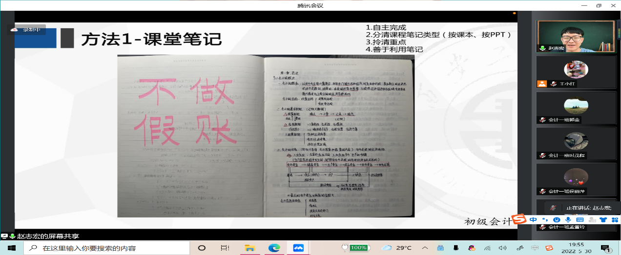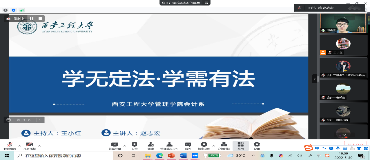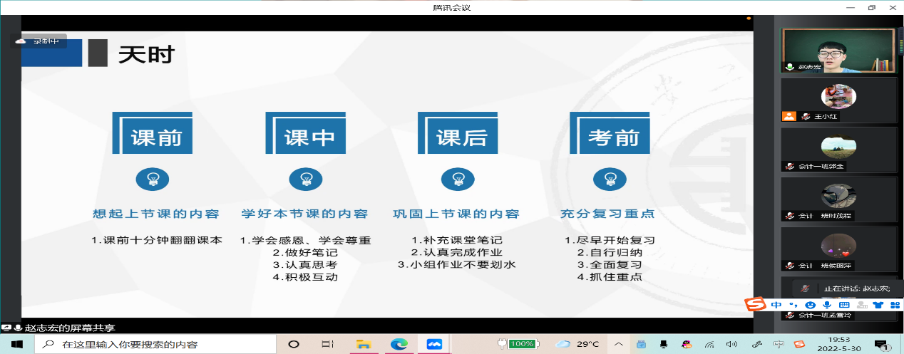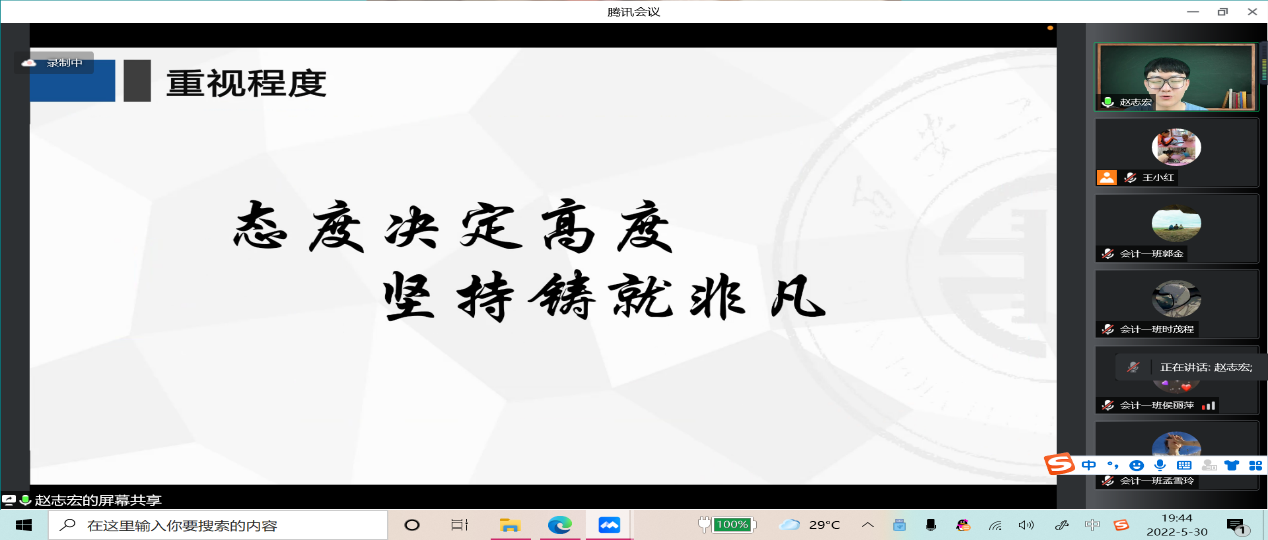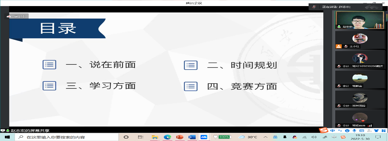 5月30日,周一晚七点,由会计系主任王小红老师主持的“三全育人”团之“学无定法,学需有法”系列讲座——榜样讲座,在腾讯会议顺利召开,会议由李军训老师、孟亚丽老师、田谧老师、陈宝东老师等部分老师参与,由来自会计专业大三的员工赵志宏为大一至大三的同学们讲述他充实的大学经历。