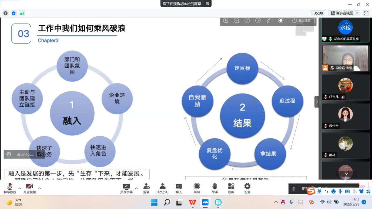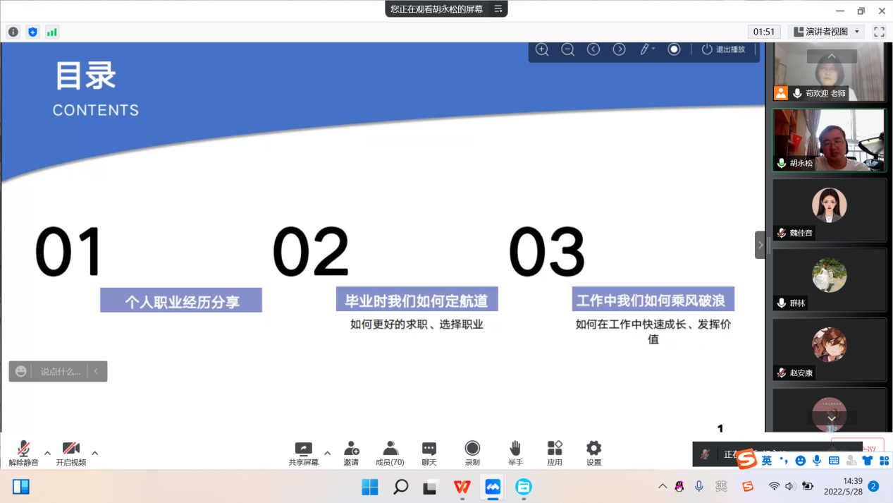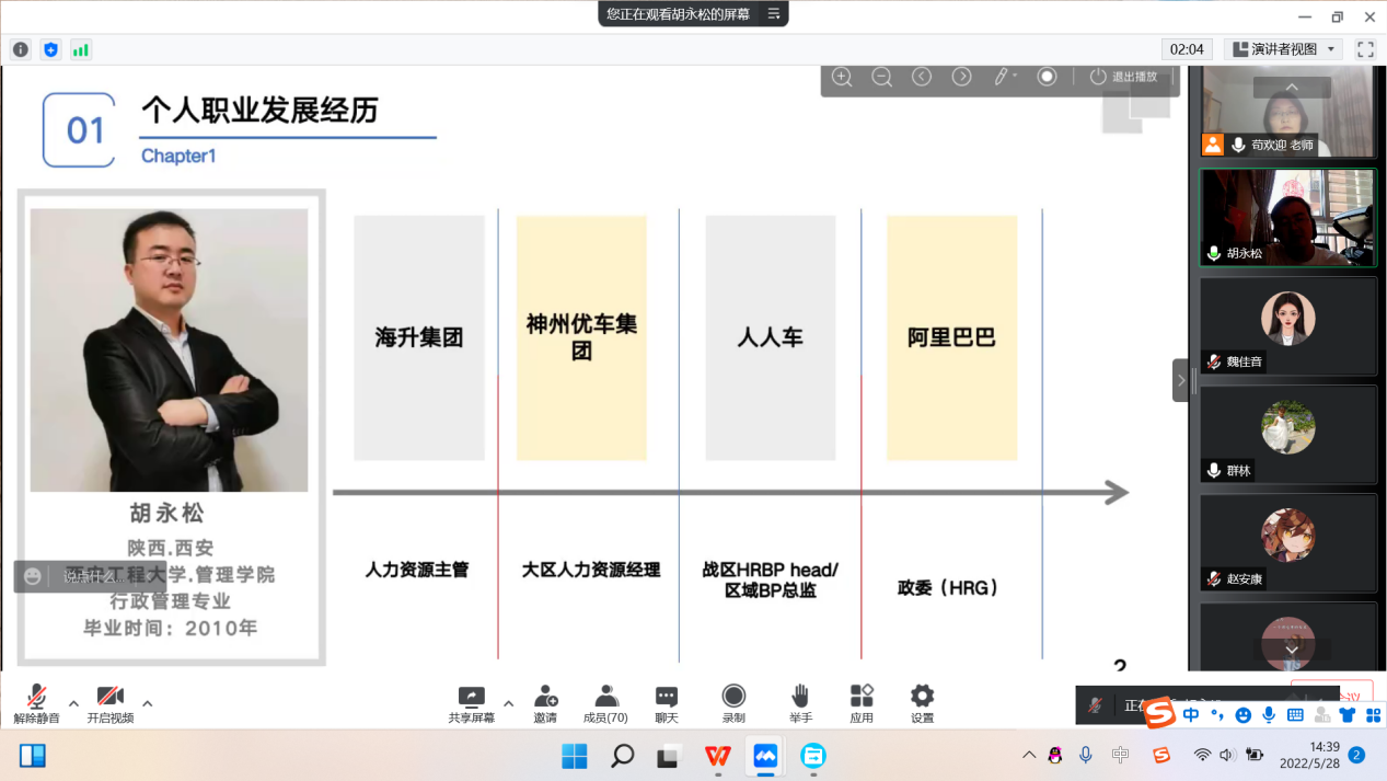 为充分发挥公司优秀员工作为就业典型的引领示范作用,增强行政管理专业员工的职业意识,帮助即将求职的同学指明方向,解决同学们关于企业部门求职存在的疑难问题,2022年5月28日下午,行政管理专业三全育人导师团采用线上会议的形式,开展了“学长有话说——企业部门求职与职业发展”经验交流会。参加本次活动的有行政管理系主任、导师团副团长张群林,导师团教师苟欢迎以及行政管理专业在校员工。本次邀请到的主讲人是行政管理2010届毕业生、阿里巴巴政委胡永松,会议由导师团教师苟欢迎主持。