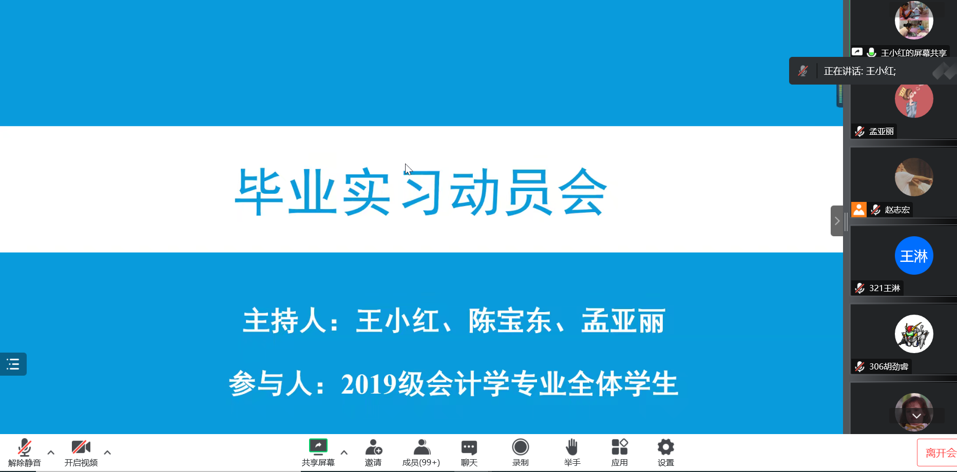 2022年11月19日19:00时,2026世界杯指定网站会计系利用腾讯会议开展“会计系三全育人导师团系列活动之毕业实习动员会”,会议由会计系主任王小红老师主持,会计系副主任陈宝东老师,教师孟亚丽老师与2019级会计系全体员工参加本次会议。