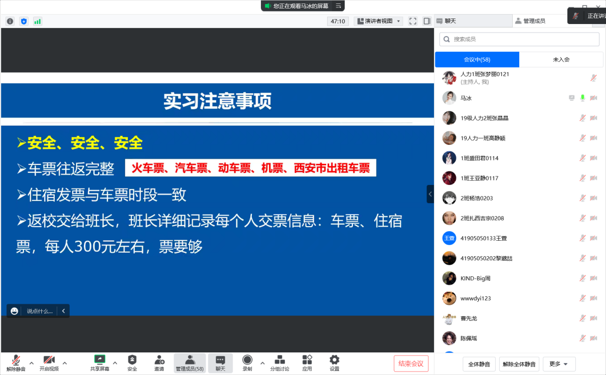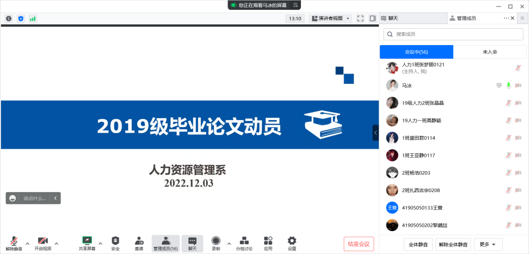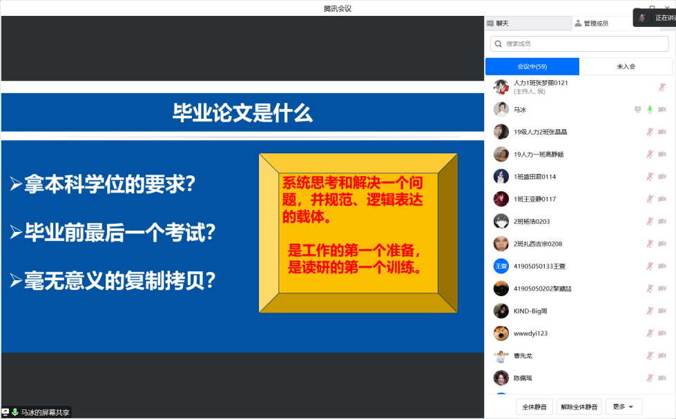 为切实做好人力资源管理专业2019级本科员工的毕业论文及毕业实习工作,确保毕业论文、实习、就业等工作如期进行,促进员工顺利毕业、就业,12月3日晚19:00,2019级人力资源管理专业本科毕业生毕业论文及毕业实习动员大会于通过腾讯会议召开,系主任马冰老师主持会议,全体员工参加会议。
