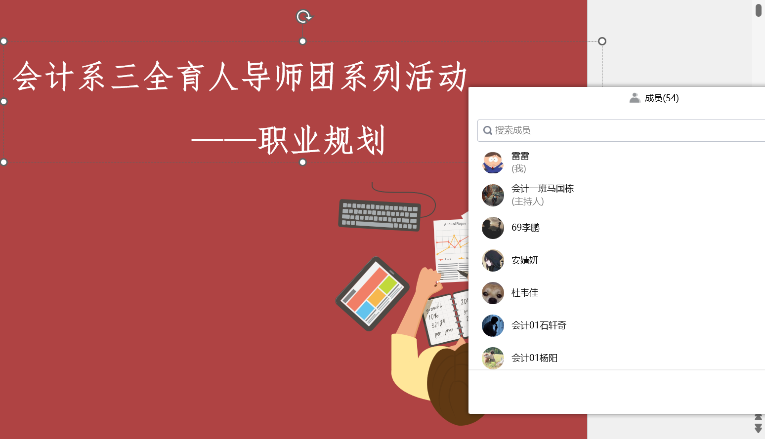 2022年12月8日8点,本次“会计专业三全育人导师团系列活动——职业规划”在线上进行,本次活动由宋玉老师和雷雷老师主持,会计2201-2202班员工参加。