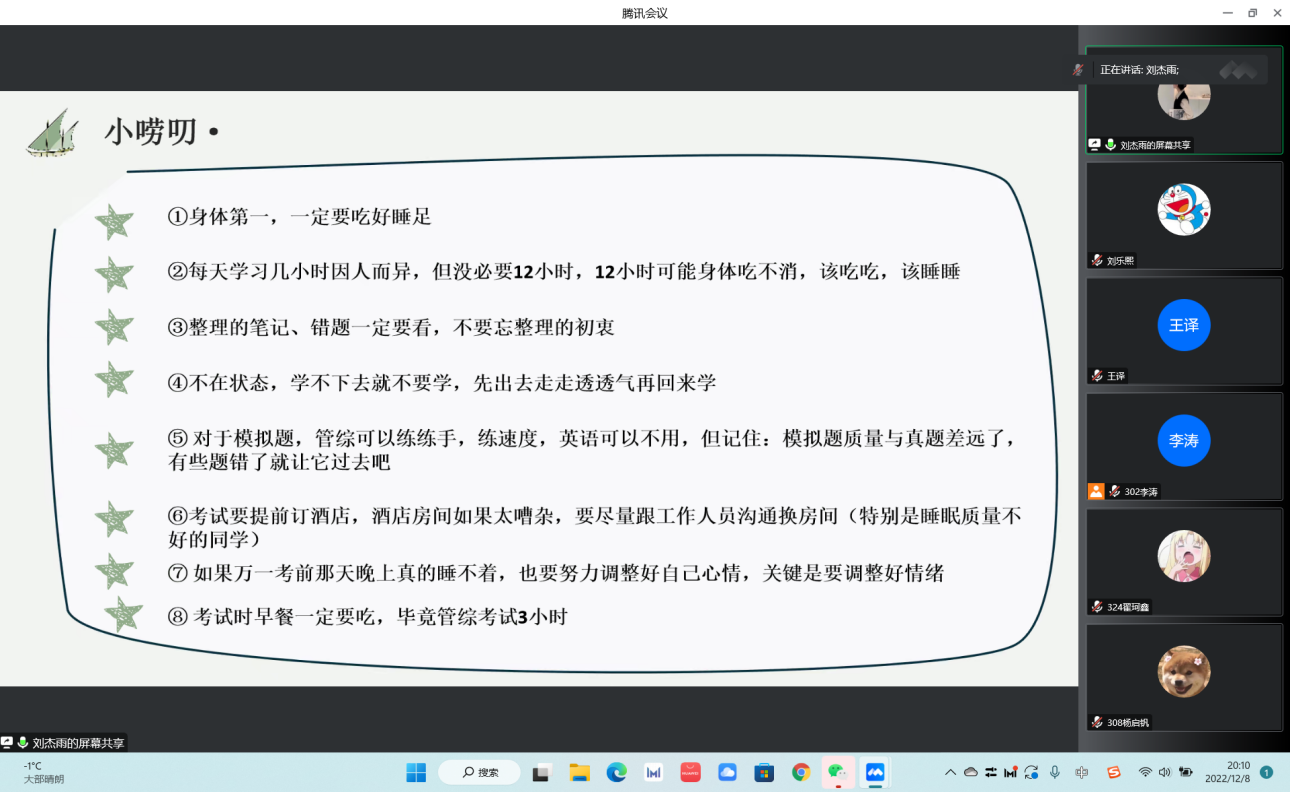 2022级MPAcc的刘杰雨首先做了分享,针对各科特点和考试重点做了全面详尽的分析。强调了多个考场注意事项,分享了自己对于考试的心得体会。建议同学们根据实际情况,调整身心状态,做好试前准备,胜利就在前方。