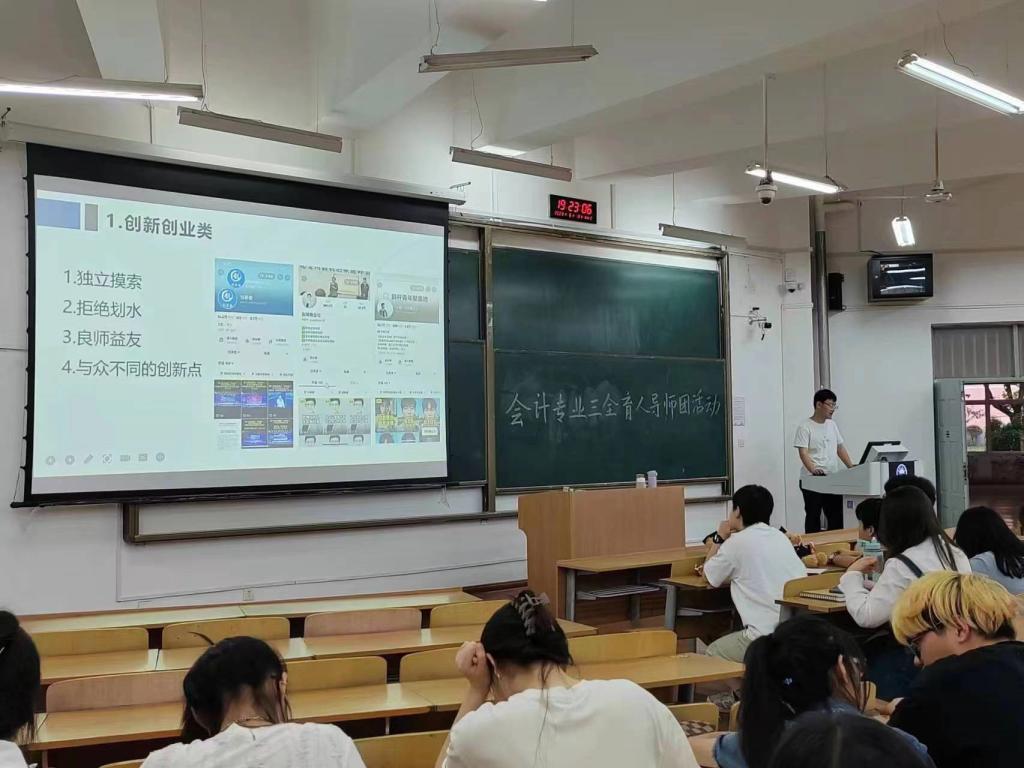 首先是保研的三位同学分享经验。赵志宏主要向大家讲解参加竞赛的相关经验。他分别介绍了参加创新创业类竞赛、会计类竞赛和论文报告类竞赛的自身感受和相关经验,并告诫大家在参加竞赛的同时要以学习为重、量力而行,并且要做到与自身未来发展规划相契合。张佳逸主要向大家讲解参加课程学习的相关经验。她强调学习数学类课程需要善于归纳总结,并且要多做习题加以练习,学习会计专业类课程则可以通过思维导图、详细的课程笔记、理解性记忆、实操练习等方法提高成绩。雷欢婷从自身支教保研的经历讲起,向大家介绍了她决定支教的心路历程,并向大家详细讲解了研支团的相关概念和支教保研的相关条件,最后告诫大家“条条大路通罗马”,要抓住每一个实现梦想的机会。