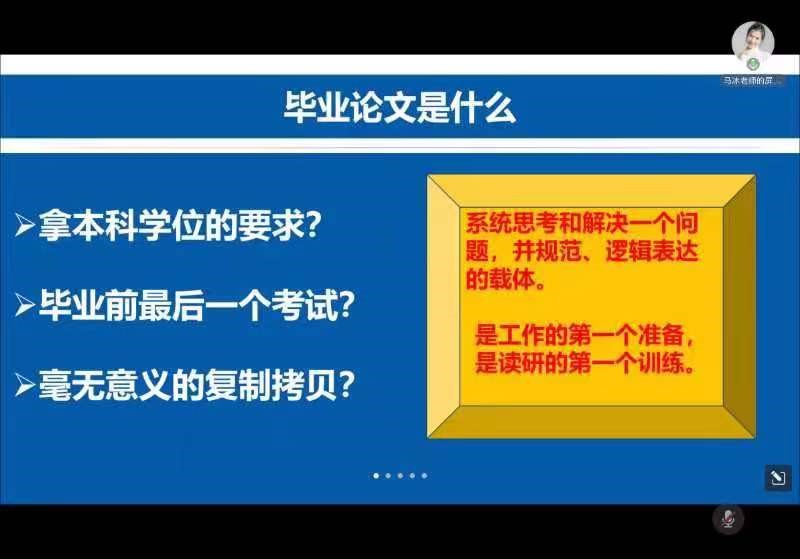 随后,马冰老师提出了毕业论文写作中的要点。她指出,毕业论文最重要的是诚信行为,要杜绝学术不端。其次,毕业论文是员工在学术领域的首次独立探索和尝试,也是专业知识、独立思考及解决问题能力的综合体现,要注重论文的逻辑性和连贯性。再次,她鼓励同学们勇于挑战、积极进取,努力提升自己的学术水平和综合素质。最后,她希望同学们的论文能具备理论意义和实践意义,在学术领域取得更加优异的成绩。