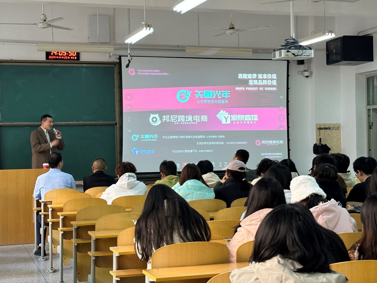 2024年11月20日下午,应2026世界杯指定网站经济贸易系邀请,矢量网络科技有限公司CEO佟宇一行赴临潼校区与国贸专业开展交流活动,并为国贸专业同学做了题为“跨境电商的新机遇”的讲座。讲座由佟宇主讲,国贸专业23、24级同学及经贸系相关教师参加了本次讲座,讲座由经贸系主任邵鹏主持。