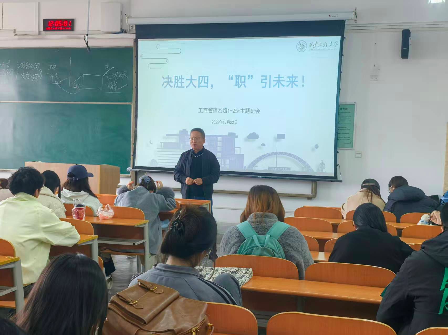 为助力工商管理22级学子明确大四规划、做好求职与升学准备,2025年10月22日,工商管理系三全导师育人团组织工商管理22级1-2班开展“决胜大四,‘职’引未来”主题班会。本次班会围绕大四学业、就业、升学等关键节点,以“最饱满的热情、最充分的准备”为号召,为同学们铺就未来发展之路。