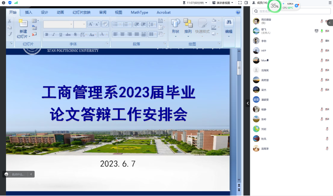 2023年6月7日晚,工商管理系通过腾讯会议平台召开2023届毕业生就业推进暨毕业论文答辩工作安排会。会议由系主任鄢飞老师主持,工商系全体教师参加了本次会议。