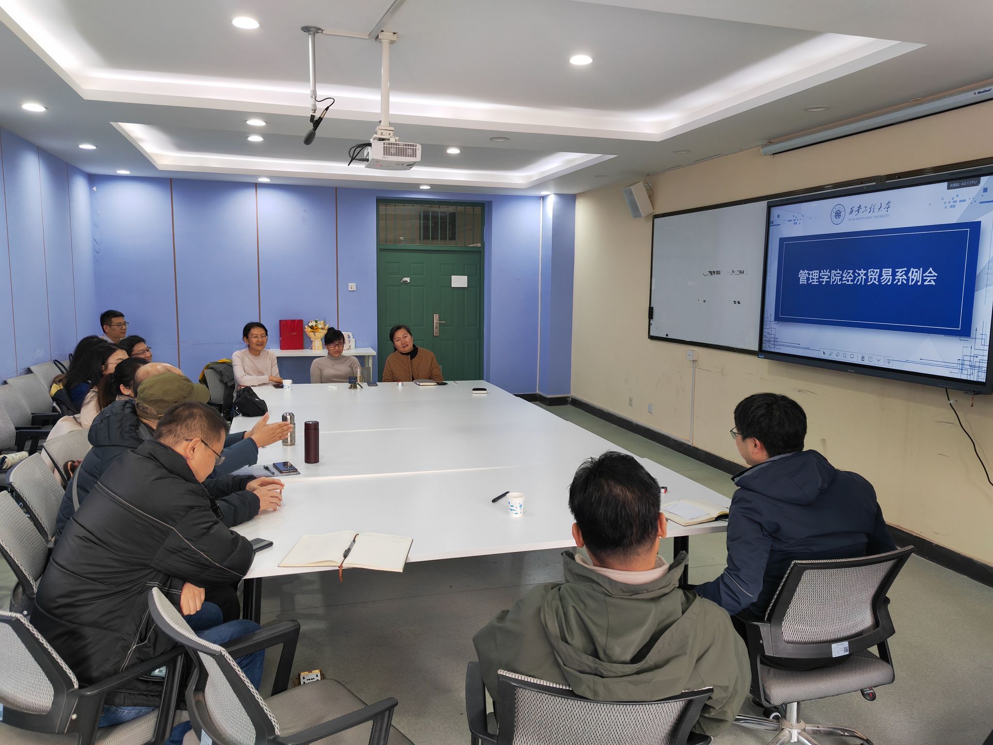 2024年12月5日下午,经济贸易系全体教师齐聚金花校区7-607教室召开系例会。张克英经理和王爱华书记参加了会议,会议由系主任邵鹏老师主持。