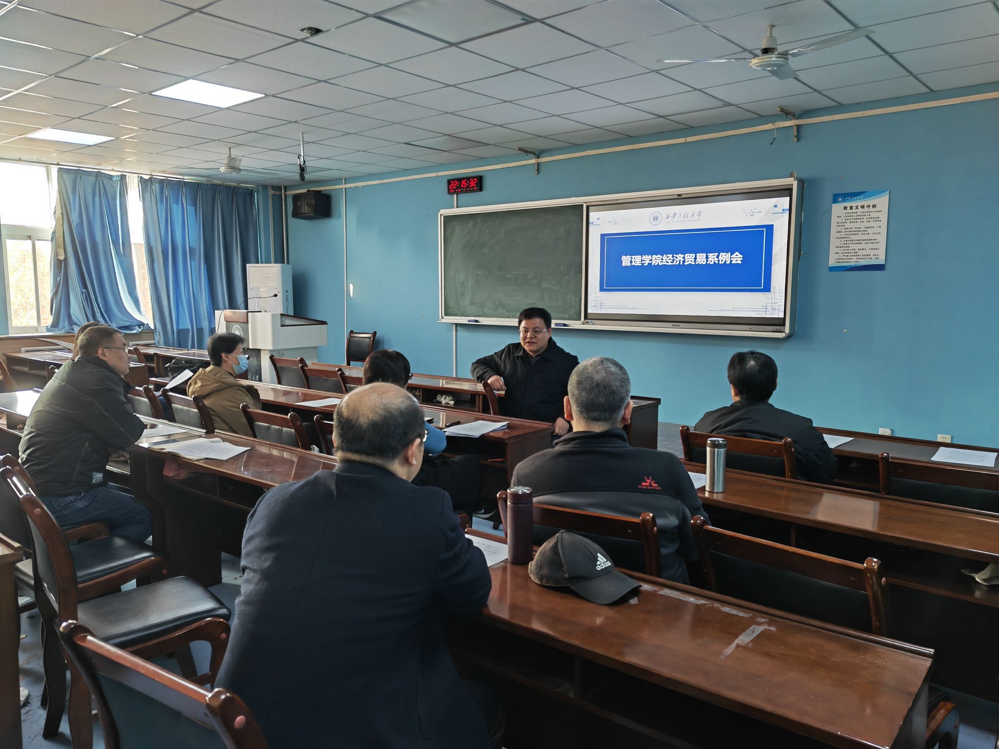 陈恒副经理向全系教师介绍了目前院校两级关于专业发展的相关政策要求,就国际经济贸易专业未来的可能发展方向进行了介绍。陈恒副经理根据《陕西省“一流专业”建设标准(本科)》的要求,对标对表提出了专业发展的具体要求。随后,全系教师对国际经济贸易专业的未来发展进行了热烈讨论。最后,邵鹏老师对经济贸易系本学期的教学工作进行了梳理,对会议进行了总结。