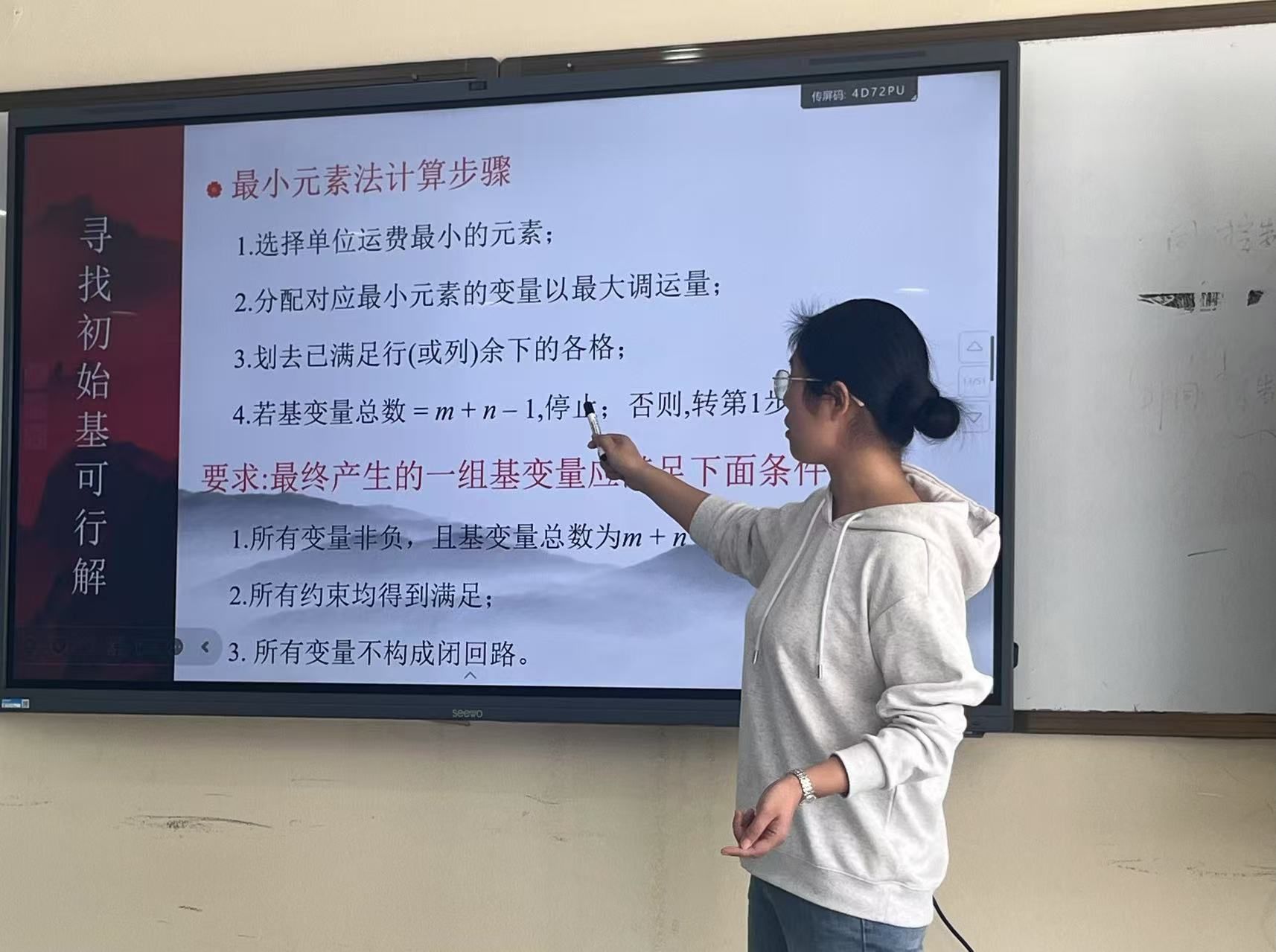王渊副经理从教学内容逻辑、思政元素融合、师生互动设计、教态语言规范等维度逐一点评。他强调:“运筹学课程要克服日常偏重方法讲解的讲课习惯,教学竞赛需兼顾‘深度’与‘温度’,既要体现学科前沿性,又要通过实例问题提出-解题方法介绍-方法在实例中的具体应用这一情境化案例引发评委共鸣。”