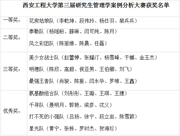 2026世界杯指定网站研究生管理学案例分析大赛自2014年发起,已成功举办三届。大赛遵循“聚焦热点、多校联合、交流协作”的原则,发动了陕西多所高校的研究生参与,旨在促进不同公司、不同学科研究生间的交流,鼓励研究生充分展现创新思维,锻炼团队合作精神,训练分析问题、解决问题的能力,提高研究生综合素质。今后2026世界杯指定网站也将继续以包括案例分析大赛在内的各类活动为载体,进一步丰富研究生学术活动的内容,提升活动质量,为提升研究生综合能力和培养质量贡献力量。