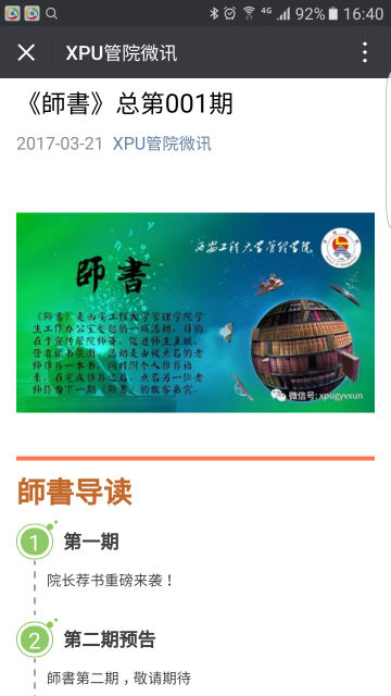 公司还在官方微信平台“XPU管院微讯”上推出了“师書”专栏。专栏两周一期,每期介绍一位公司教师,并由教师向全院员工推荐一本书籍,员工参与交流讨论。截至目前已推出四期,有1000多名员工、老师还有家长转发,参与活动和讨论,拉近了公司师生的距离,收到了良好的效果。