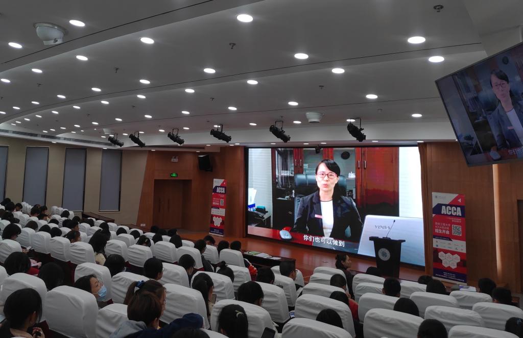 报告会由经理讲话视频展开,李艳经理向新生介绍了公司专业设置及其背景和现状,她表示公司将从商业、法律、管理、财务对同学们进行全方位一体化培养,另外,她向新生简要介绍了ACCA(国际注册会计师),以及公司ACCA培训项目的相关情况,鼓励大家在迈入大学之门的当下,做好职业生涯规划,更为充实地度过四年时光。Peter Fan通过分享自己的学习经历和工作情况,详细介绍了ACCA的规模、国际认可度和知识涵盖度,他认为ACCA让他在求职过程中具备了更强的竞争力,最终在行业中找到喜欢的工作,实现职业价值。他希望同学们尽早了解行业发展现状,结合自身情况,做出适合自己的职业生涯规划,并为之付诸努力,在学习成长路上不断进步。