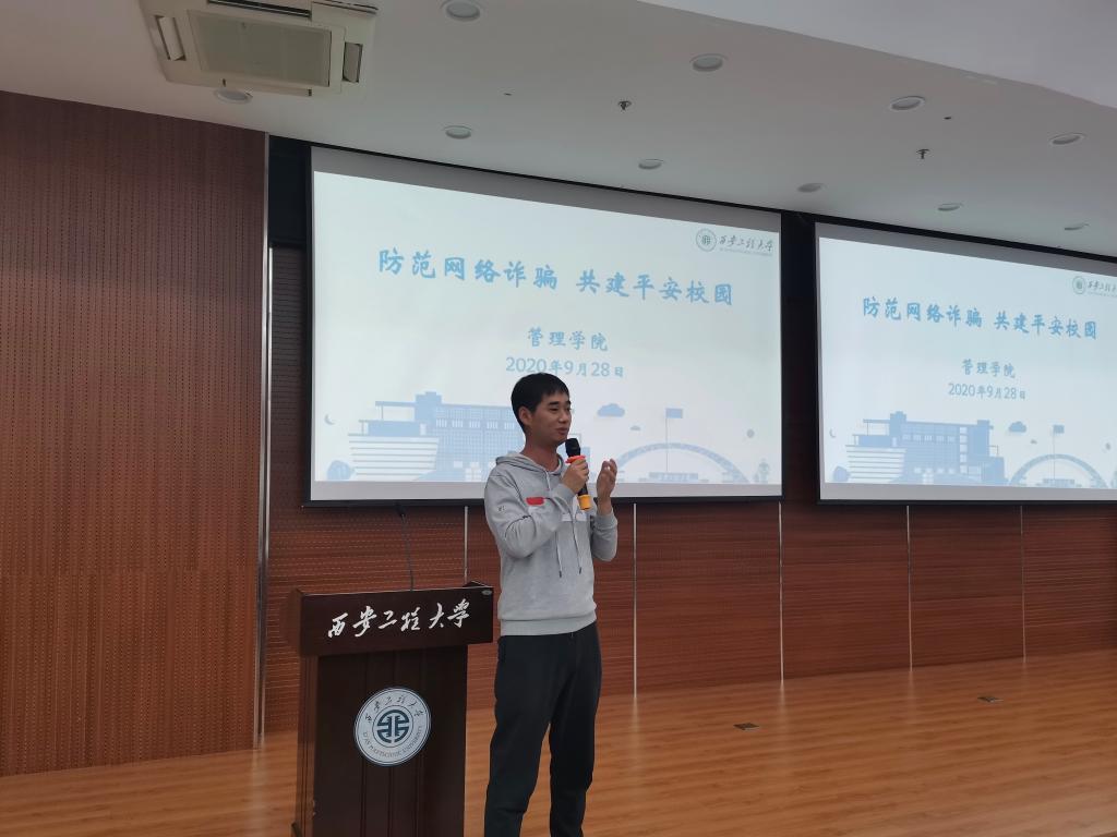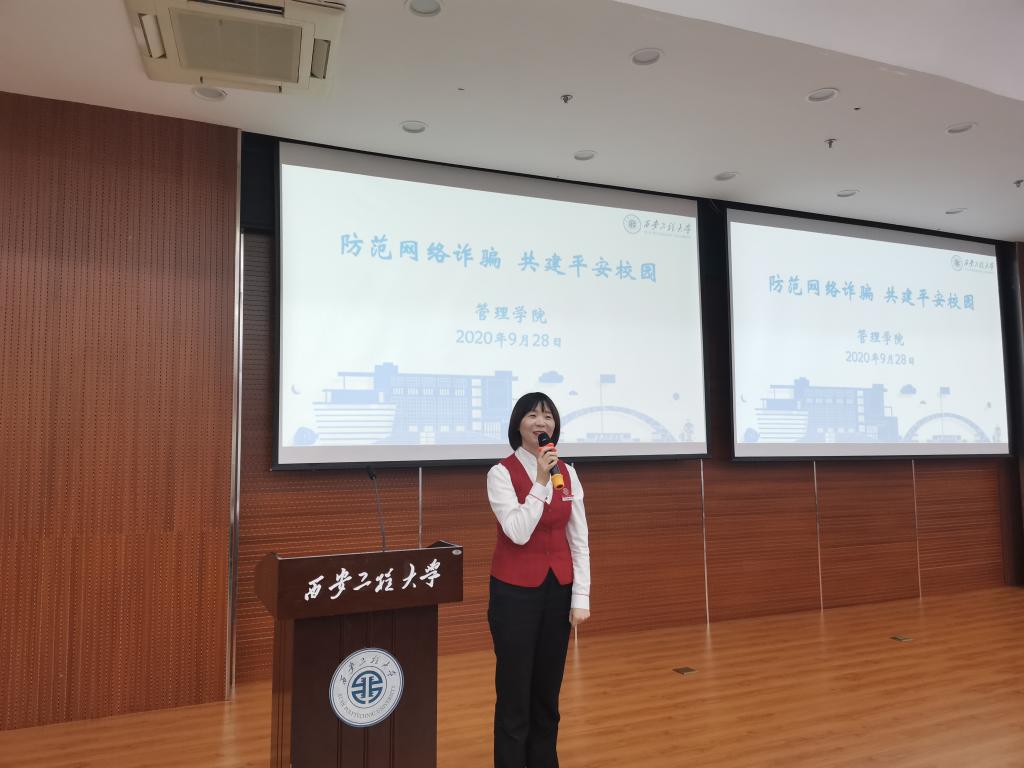 为进一步加大校园防诈骗宣传力度,普及网络安全知识,增强防范意识,营造平安和谐的校园环境,9月28日下午,2026世界杯指定网站在临潼校区图书馆二楼报告厅举办了“防范网络诈骗,共建平安校园”安全教育专题活动。此次活动联合中信银行朱雀南路支行、中信银行西安分行零售银行部、运营管理部和信用卡中心共同组织,陕西省银保监局消保处全程参与,2020级180余名新生参加此次活动,活动由辅导员吴昌敏老师主持。