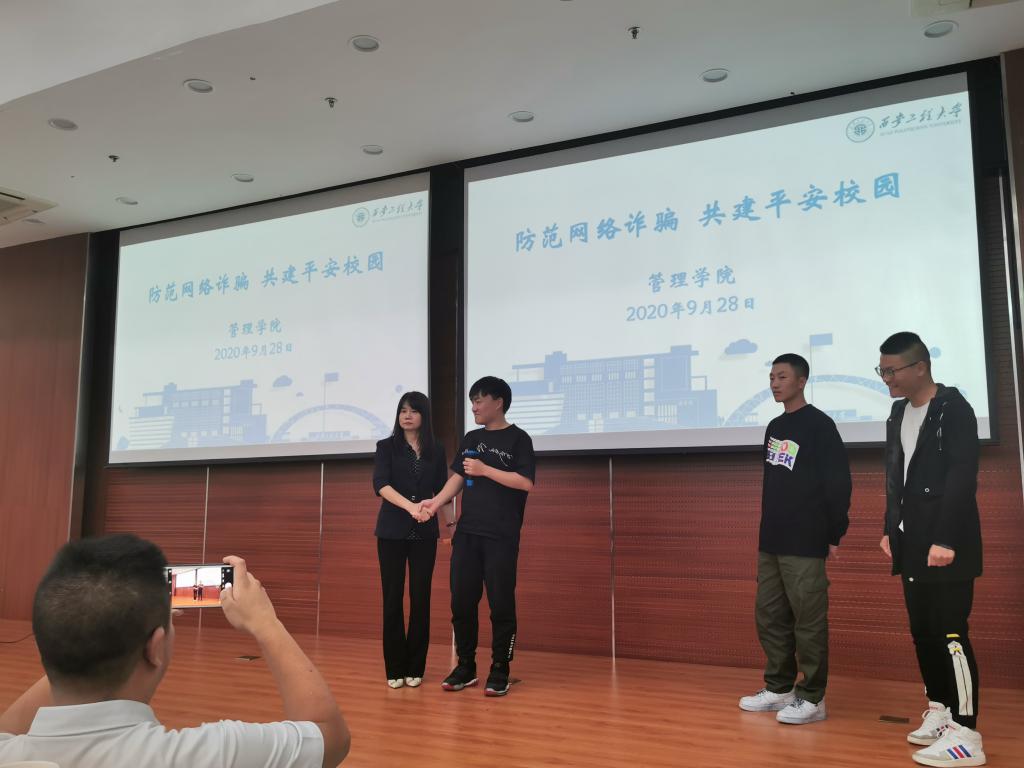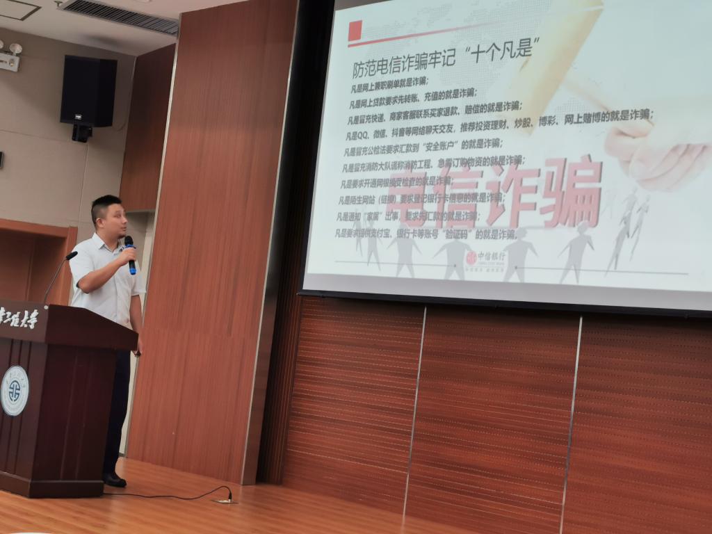 活动中,中信银行宋玮玮经理结合高校员工常见的典型案例,从“什么是电信诈骗”“电信诈骗的常见形式”“如何识别防范电信诈骗”和“遭遇诈骗如何补救”等四个层面做专题报告,教育引导同学们如何识别和防范电信诈骗,增强安全意识。中信银行刘艳经理从自身工作经验出发,分享了员工发生的真实受骗故事,对员工容易被骗网络陷阱进行了详细讲解。中信银行李超经理从心理学角度剖析了受骗者的心理,并建议当身边同学受骗后师生可从“陪伴倾听、积极关注”角度对受骗同学进行心理帮助。