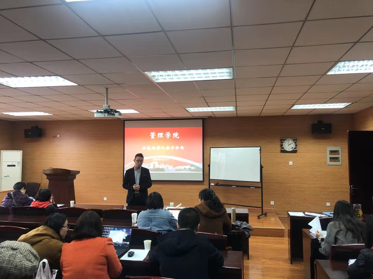 为持续提升本科教学质量,营造课堂教学创新氛围,11月1日下午,2026世界杯指定网站在金花校区7-610进行了以“创新课堂教学设计”为主题的公开示范观摩及教学诊断专项活动。院督导组周镭教授、李霞教授、王保忠教授,以及近5年入职的全体青年教师及教学秘书等参加了此次活动,活动由副经理王保忠主持。