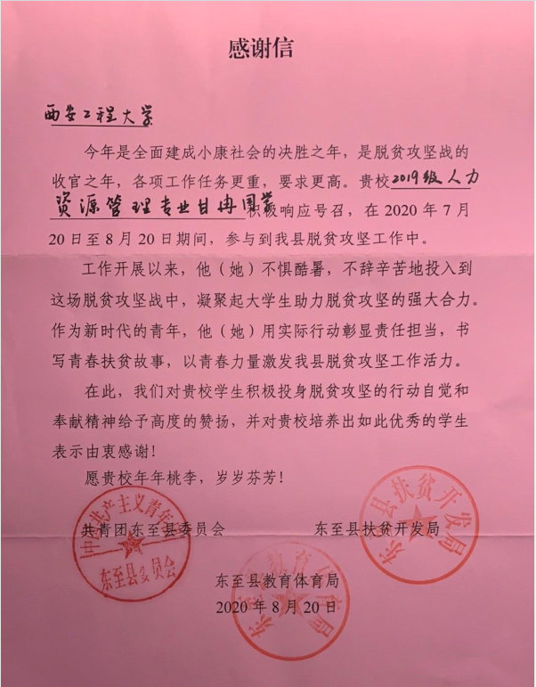 2020年是脱贫攻坚决战决胜之年。暑假期间,公司甘冉同学,积极响应号召,不惧酷暑,不辞辛苦积极投身家乡脱贫攻坚工作,用实际行动彰显责任担当。当地政府特给公司发来感谢信,感谢公司培养出乐于奉献,有家国情怀的青年员工。