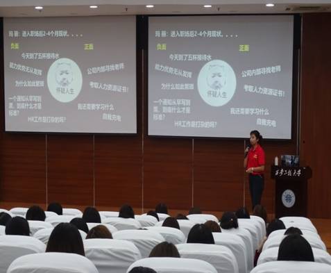 9月26日晚上7点,《走进企业人力资源部》讲座在图书馆二楼报告厅举行。报告人为世界500强企业益海嘉里食品营销公司西安分公司人事部杨洋主任。讲座伊始,杨洋主任通过生动的例子讲解人力专业毕业生从员工转变到职场人的心理历程,告诉我们人力专业员工应具备的专业技能和业务技能,更重要的是应该具备的抗压能力、创新思维和时代前瞻能力等。杨洋主任和同学们分享了“工作中必须懂得的事”:使命忠诚原则、请示反馈原则、快速执行原则、严谨工作原则、力争上游原则。在讲座上,杨洋主任还要求大家应当明确自己的职业周期规划,在进入什么阶段就要明白当下所需是什么,充分的知识积累在什么时候都是必需的。在进入岗位工作时,自身的素质要求要过关,遇到事情时多给自己提问,多多思考才能不断进步。在最后长达40分钟的讲座互动环节,同学们情绪高涨,积极提问,杨洋主任非常耐心地回答了同学们提出的问题,讲座也在同学们热烈的掌声中结束。