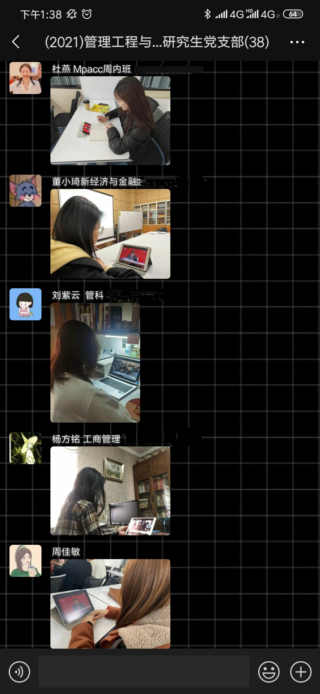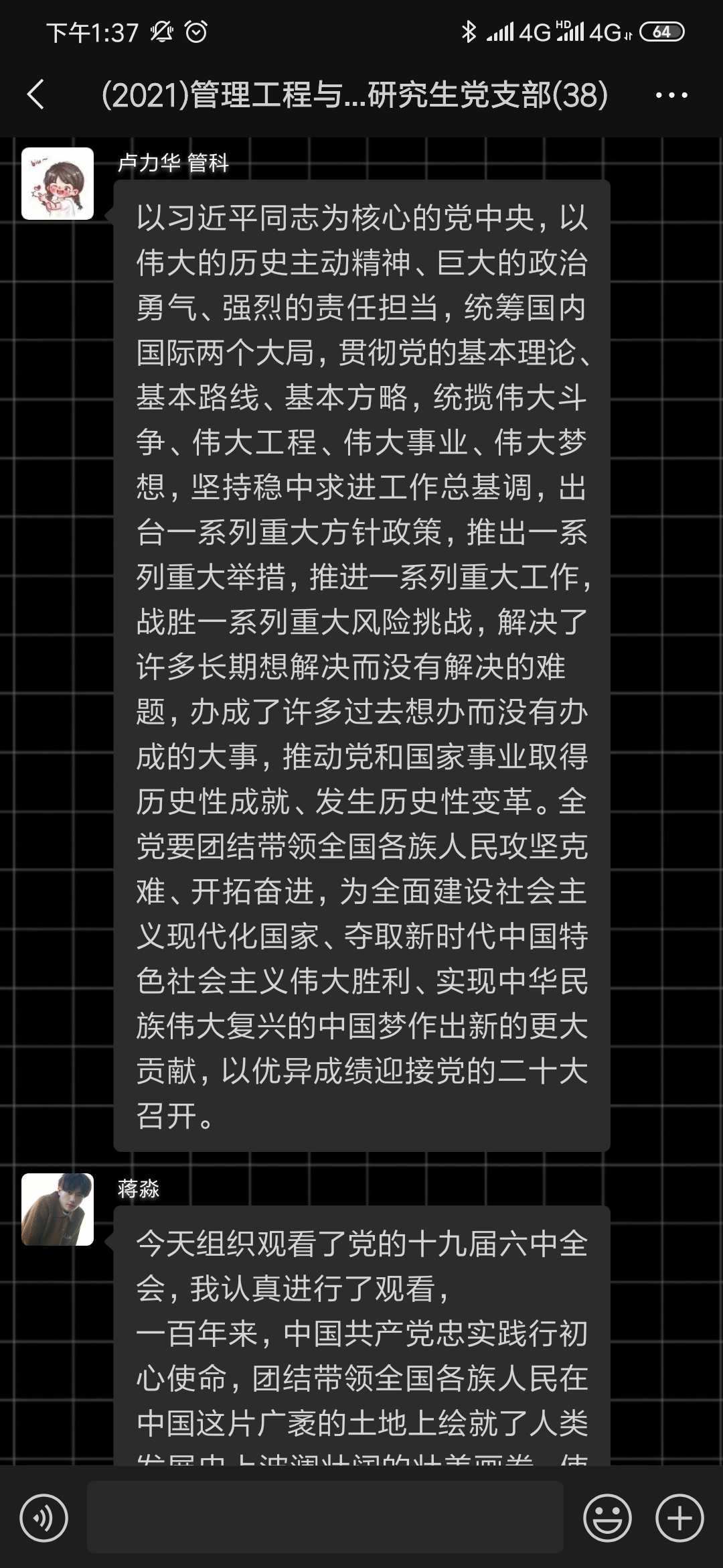 观看完新闻发布会直播后,支部成员在微信群开展了线上学习讨论。李浩同志表示:“党的十九届六中全会是重要历史时间节点召开的一场具有全局性、历史性意义的重要会议。我们要认真学习中国史、党史,要勇担时代使命,延续爱国情怀,坚持社会主义道路,坚持维护党的领导,争做优秀的社会主义接班人。”马渭斌同志认为:“我们要深入学习此次会议精神,充分了解我党的百年奋斗重大成就和历史经验,作为新时代的青年,我们要努力承担起党员应尽的责任和义务,不断充实自己的理论基础,为实现伟大的中国梦贡献自己的一份力。”其他同志相继交流了此次观看党的十九届六中全会精神新闻发布会的体会和认识。
