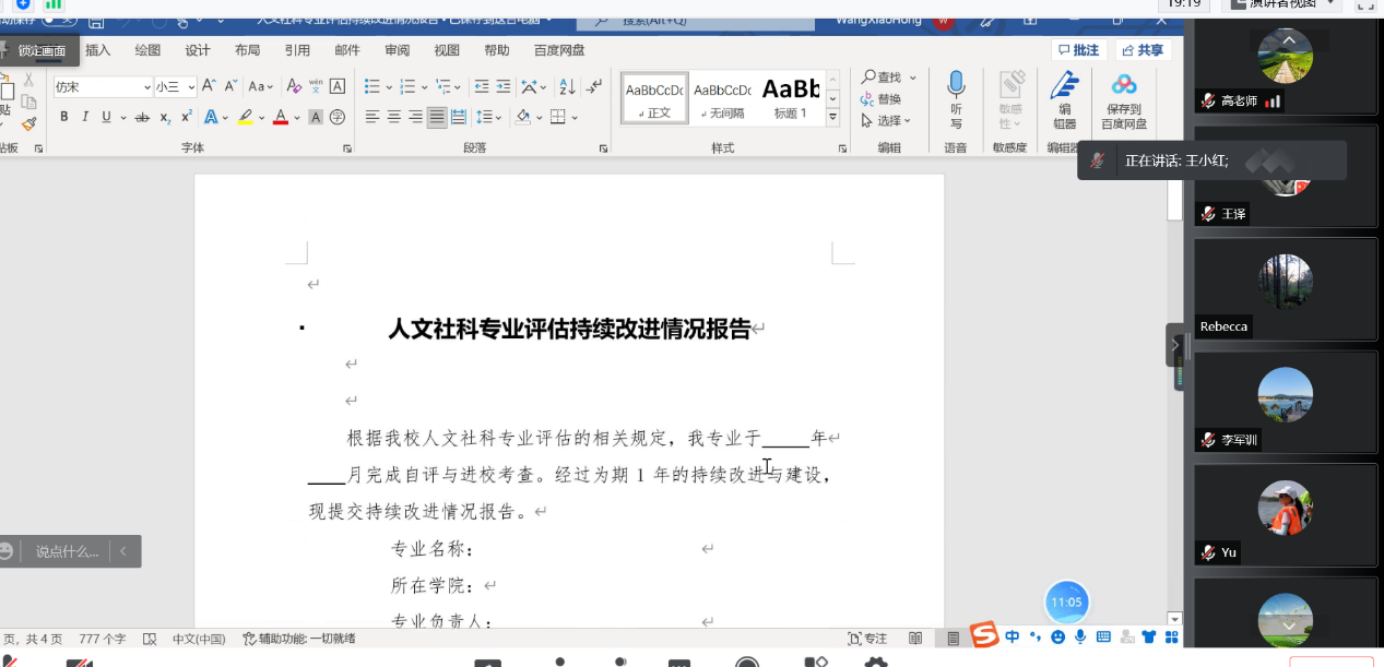 其次,王小红老师讲解了人文社科专业评估持续改进情况报告各部分的要求,要求各部分从意见中提出的问题及关注项、改进措施及取得成效、仍然存在的问题及改进计划三个方面进行撰写。同时,着重强调了对2020版大纲于2022年度执行开展的所有课程的原始评价材料要保存完整,因为这些资料也是后期专业审核性评估的重要内容。