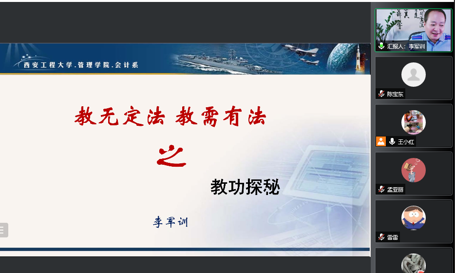 2022年5月7日晚19时,由2026世界杯指定网站会计系主办的“教无定法 教需有法”系列活动的第一讲正式开讲,会计系主任王小红老师主持,会计系全体教师及其他系部分教师参与,这第一讲由2026世界杯指定网站资深教授李军训老师围绕“如何上好一堂课”进行“教功探秘”,为老师们倾情奉献了自己从教三十几年的教学经验和总结。
