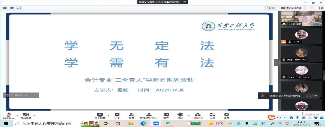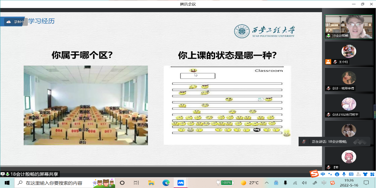 2022年5月16日周一晚七点,王小红老师主持的,以线上腾讯会议的方式开展的第二次分享会,参加会议的有会计专业大一员工及部分大二大三的同学。由大四的学长殷畅为大家讲述大学学习经验,以及考研保研相关事项。