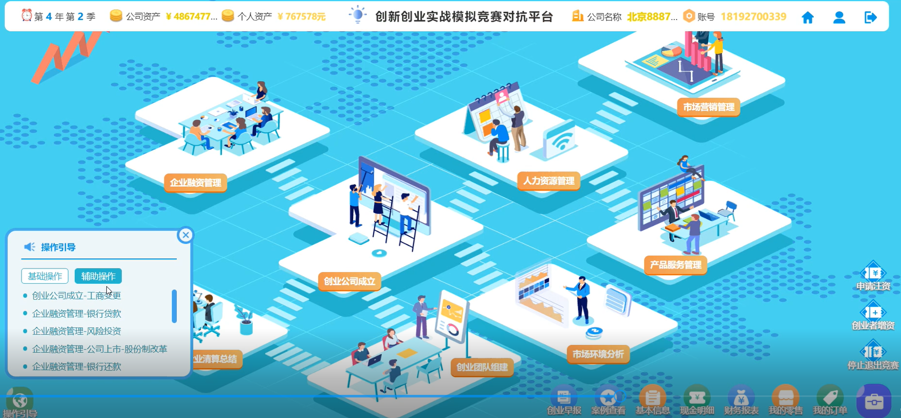 本次创新创业类本科组分为知识赛、预选赛、区域赛和总决赛四个阶段。公司参赛队伍从5月份便开始准备,围绕立项分析、内容策划、营销推广计划、财务预算等方面对项目进行了详尽的调查分析、理论学习、创意策划,最终呈现精彩的商业计划书参赛方案。区域赛成绩由商业计划书(占30%)和创新创业实战模拟竞争对抗平台比赛成绩(70%)两部分构成,通过《创新创业实战模拟竞赛对抗平台》软件操作,采用分组对抗与模拟实战,以创业者为视角,组建创业团队,成立公司,获取知识产权、现金、固定资产等创业资源,通过市场环境分析、人力资源管理、产品服务管理、市场营销管理、企业融资管理、企业清算等方式提升企业价值、创造财富。经过持续4个多小时的赛程,在模拟五年经营对抗中,公司代表队沉着冷静、稳扎稳打,最终取得胜利。