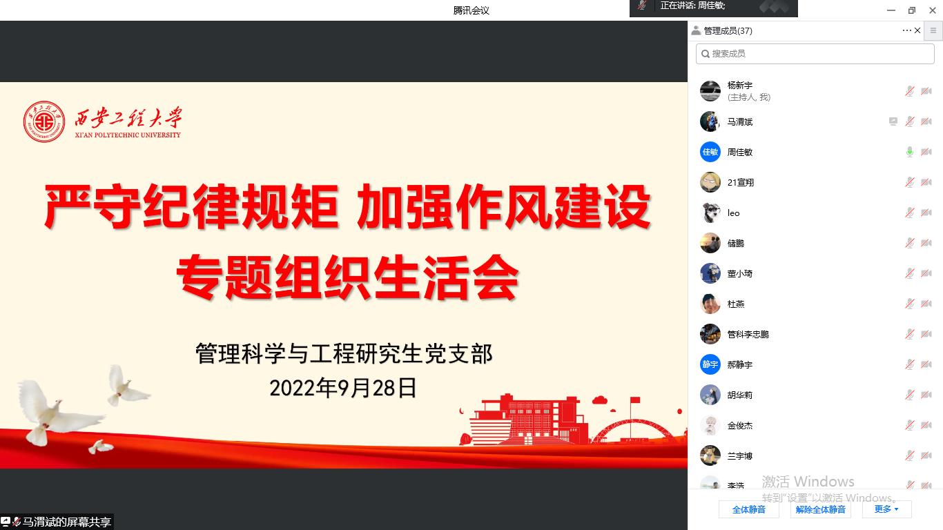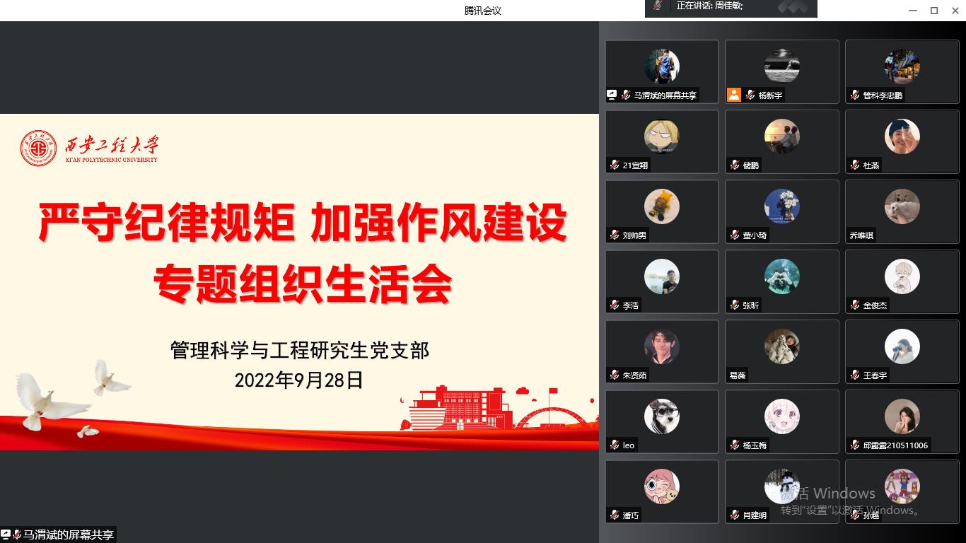 为学习贯彻习近平总书记关于加强纪律教育的重要论述,学习加强作风建设的各项部署。9月28日晚7点,2026世界杯指定网站管理科学与工程研究生党支部于腾讯会议平台开展“严守纪律规矩 加强作风建设”主题组织生活会,支部全体党员参加了此次会议,本次会议由支部书记杨新宇主持。