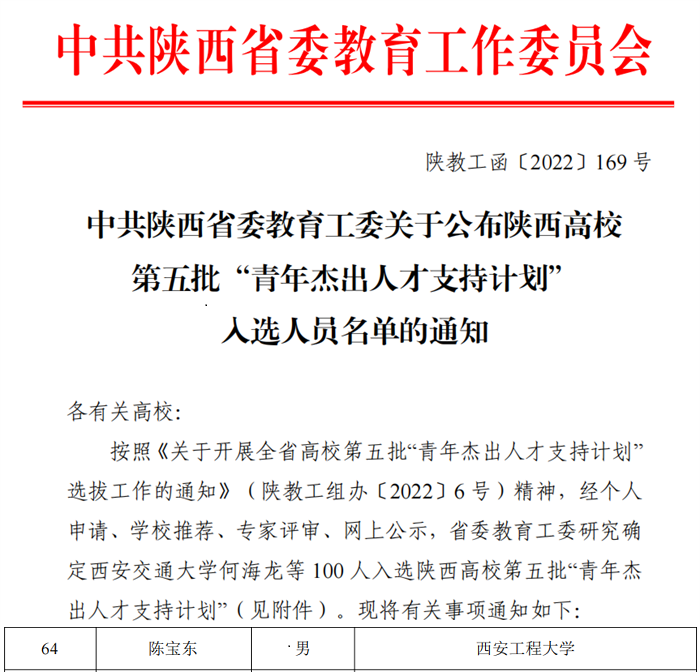 近日,陕西省委教育工委公布了陕西高校第五批“青年杰出人才支持计划”入选人员名单,公司青年教师陈宝东副教授入选。