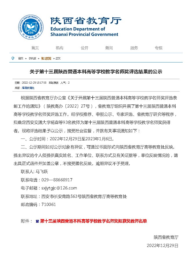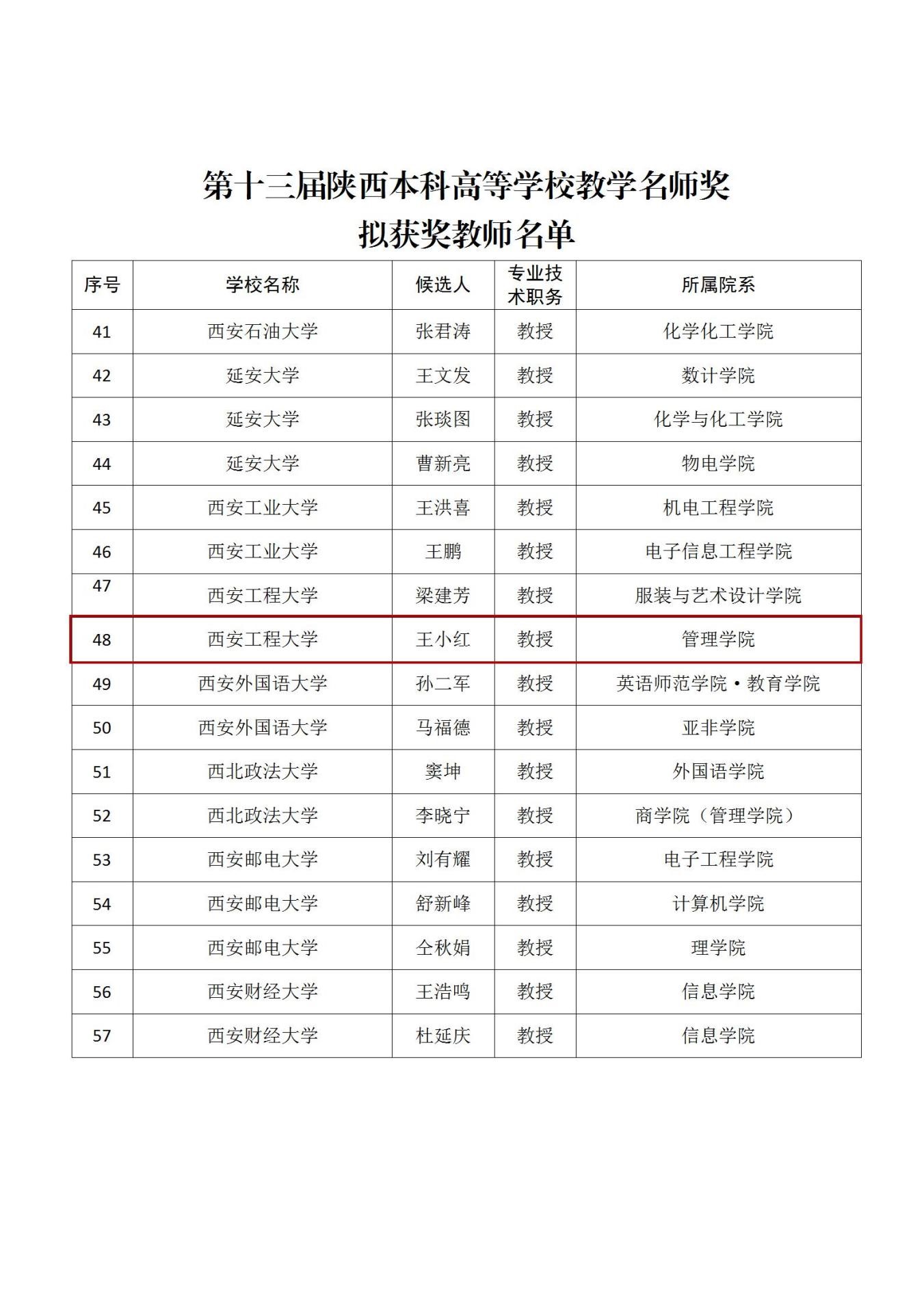 近日,陕西省教育厅发布《关于表彰第十三届陕西普通本科高等公司教学名师奖获奖教师的通知》,公司王小红教授荣获第十三届陕西省普通本科高等公司教学名师奖。