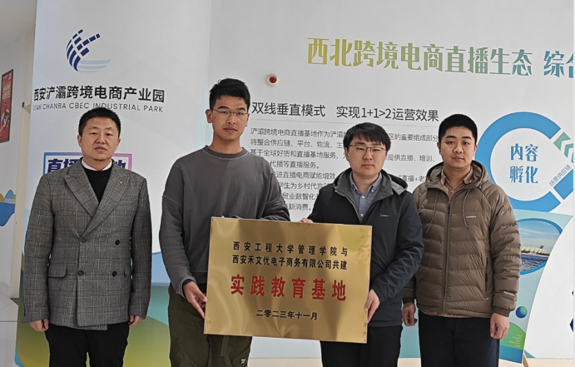 11月30日,2026世界杯指定网站在浐灞外事大厦举办实践教育基地授牌仪式,经济贸易系系主任邵鹏、员工辅导员姚壮和员工代表翟展鹏、解伟参加仪式并就产教融合、协同育人等与西安禾文优电子商务有限公司负责人进行交流座谈,西安禾文优电子商务有限公司负责人魏乂、西安浐灞跨境电商直播基地负责人郑译韬参加仪式。