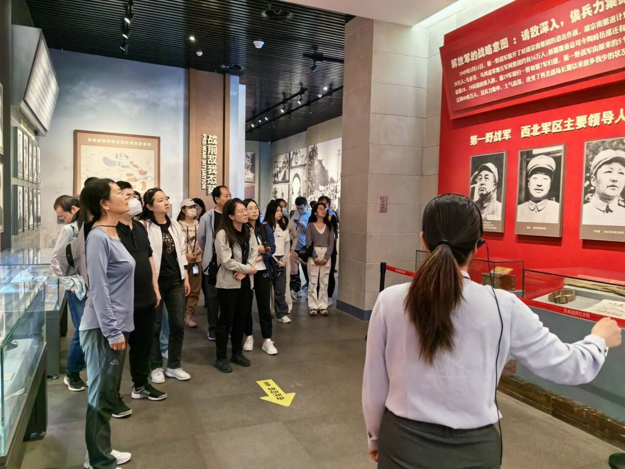 当天上午,全体党员抵达第一站扶眉战役纪念馆。扶眉战役是解放战争时期西北战场上国共双方投入兵力最多、规模最大、战果最辉煌的一次重要战役。在讲解员的带领下大家一同走进纪念馆参观学习。展馆共上下两层,分为“审时度势,运筹帷幄”“诱敌深入,决战扶眉”“军民齐心,踊跃支前”“缅怀先烈,不忘初心”四个单元,全面展示了扶眉战役的历程。馆内的一件件革命遗物、一个个英雄故事、一张张照片以图文、雕塑、多媒体演示等手段揭开了解放大西北的革命画卷,让人全方位目睹扶眉战役雄伟壮观的场面,切实感受革命烈士的壮丽人生和革命情怀。进一步激发了师生党员对革命将领们的智慧与胆识的无限敬仰之情。