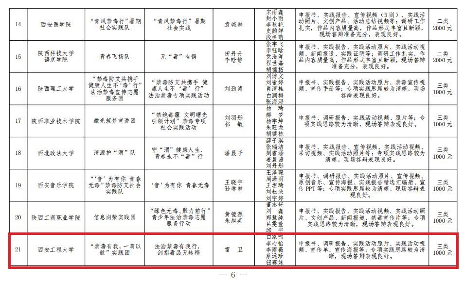 据悉,按照 2024 年度全省青少年毒品预防教育工作整体部署,结合全省大中专员工志愿者暑期“三下乡”社会实践活动安排,团 省委、省禁毒办于 7 月至 9 月,在全省范围内组织开展了以“禁毒青力量”为主题的法治禁毒专项实践活动。9月中旬,团省委对各团队资质水平、组织招募、项目申 报、实践开展、活动梳理总结等各环节资料进行了严格初审,并于11月14日在团省委机关办公楼三层青春驿站举行第二轮答辩。最终确定35支社会实践团队作为陕西省 2024 年度“禁毒青力量” 暑期“三下乡”法治禁毒专项实践活动资助团队。(撰稿:白家鸣、李心怡;审核:雷卫)