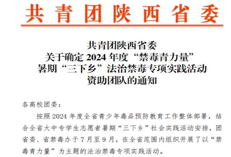 近日,根据共青团陕西省委员会下发文件《关于确定 2024 年度“禁毒青力量” 暑期“三下乡”法治禁毒专项实践活动资助团队的通知》,公司“禁毒有我,一苇以航”实践团被确定为专项实践活动资助项目。